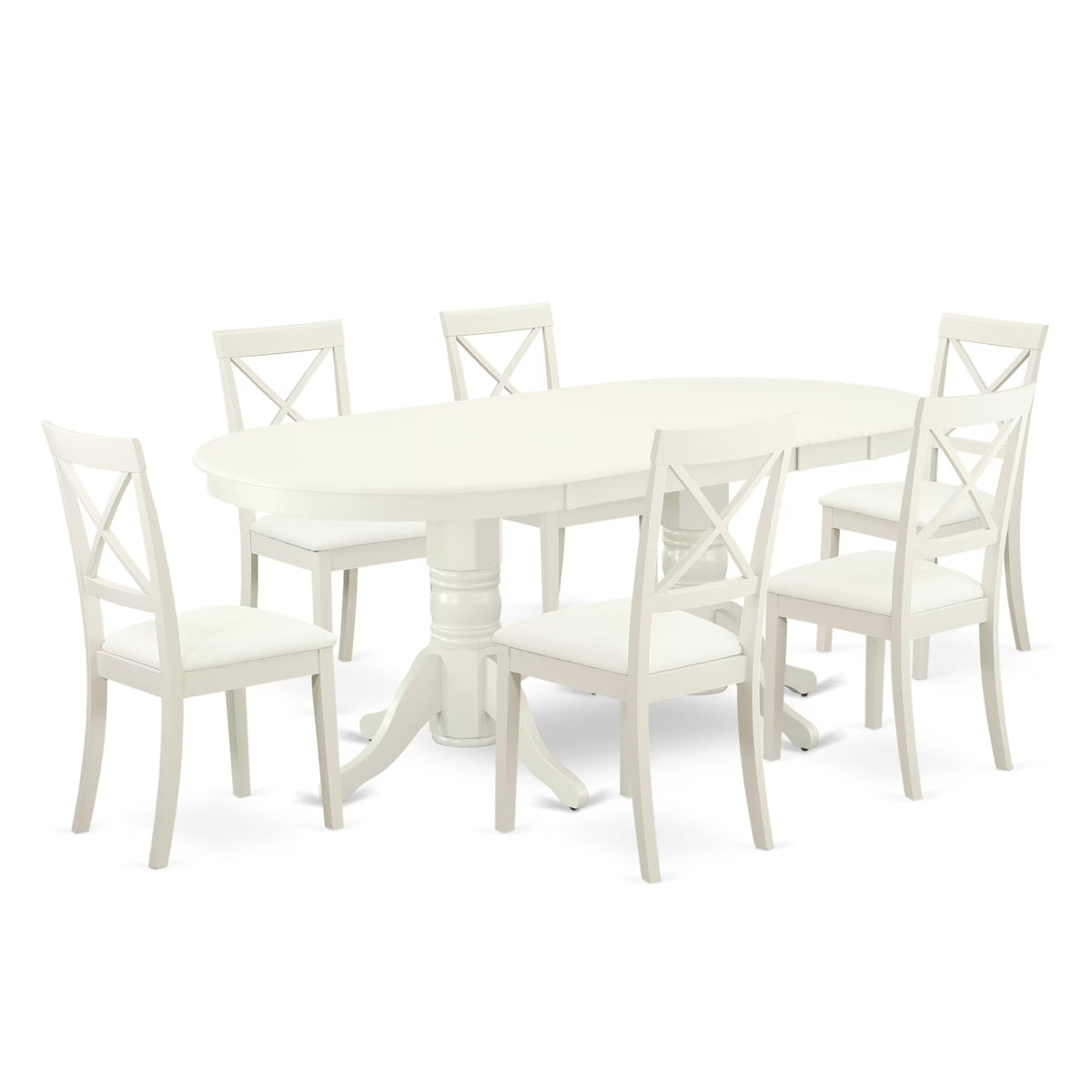 East West Furniture - Vabo7-Lwh-Lc 7-Piece Kitchen Table Setthe 7-Piece Dining Room Furniture Set Features An Elegant Oval Butterfly Leaf Dining Table And 6 High-Quality Dining Chairs. This Collection Exudes Sophistication With Its Meticulous Design And Attention To Detail, Promising To Elevate The Ambiance Of Any Dining Space And Exceed Your Exacting Standards. The Modern Dining Table Boasts A Tasteful Linen White Finish, Harmonizing Seamlessly With The Comfortable Faux Leather Seats And Linen White Wooden Legs Of The Accompanying Dining Chairs. Crafted With Precision From Premium Asian Rubber Wood, Each Chair Leg Is Equipped With Thoughtful Anti-Slip Protectors To Safeguard Your Flooring. The Dining Chairs, With Their Timeless Design And Faux Leather Seating, Emanate An Air Of Sophistication, Enhancing The Overall Aesthetic Of Your Dining Area. Their Versatile Style Effortlessly Integrates With A Range Of Interior Decor Themes, Imparting A Refined Elegance To Any Room. With Its Standardized Dimensions And Design, This Dining Set Significantly Enhances The Visual Appeal Of Your Dining Space. For Those Seeking A Contemporary, Cost-Effective, And Comfortable Dining Experience To Share With Family And Friends, This Selection Stands As A Commendable Choice.Product Features: Material: Asian Hardwood Color: Linen White Upholstered: Faux Leather Cushion Material: Foam Fabric Color: Gray Table Dimensions: Length: 76.3/59; Width: 40; Height: 30. Chair Dimensions: Length: 21; Width: 18; Height: 38. Weight Capacity: 300 Lbs.Includes: 1 Oval Table And 6 Faux Leather Chairs.