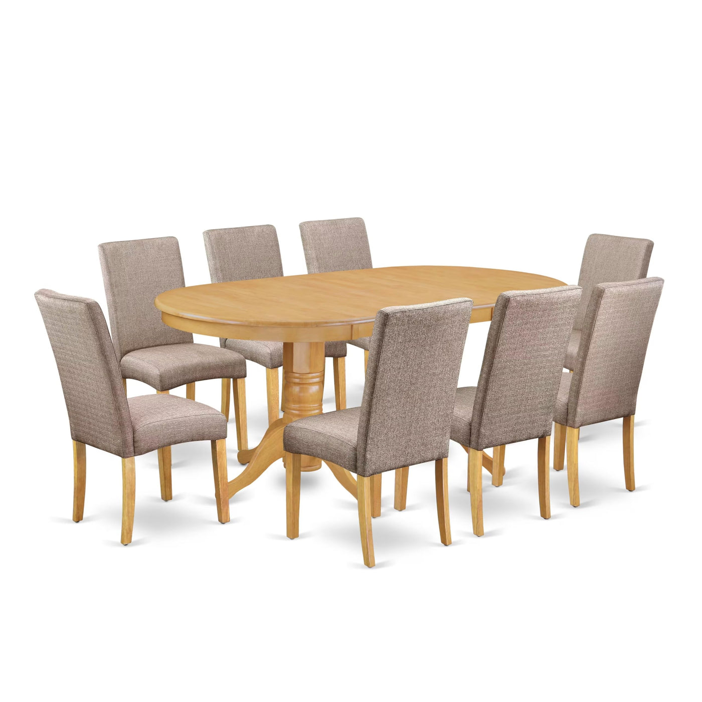 East West Furniture - Vadr9-Oak-16 - Dining Table Setour Dining Set Includes A Butterfly Leaf Dining Table And 8 Kitchen Chairs. The Elegant Oval Double Pedestal Table Set Adds Refinement To Your Dining Or Kitchen Area. With A Rich Color Finish, It Suits Various Kitchen And Dining Spaces. Sturdy Wooden Legs And Quality Upholstery Ensure Durability And Aesthetics. The Oak Tabletop And Legs Exude Sophistication, Paired With Parson Chairs Featuring Dark Khaki Seats And Oak-Finished Legs. This Curated Set Elevates Any Home Decor. Crafted From Asian Wood, Our Table Set Showcases Commitment To Quality, With Anti-Slip Protectors On Each Leg. Precision And Attention To Detail Define Our Modern Dining Set. Wooden Chairs With Linen Fabric Seats Enhance The Kitchen'S Appeal, Offering Comfort. Their Mid-Century Modern Design Complements Rustic To Contemporary Decor. The Plush Linen Fabric Seat Ensures A Cozy Dining Experience. This Budget-Friendly, Durable, And Stylish Dining Set Is Perfect For Quality Dining Moments With Family And Friends.Product Features: Material: Asian Hardwood Table Color: Oak Fabric: Linen Fabric Cushion Material: Foam Fabric Color: Dark Khaki Chair Leg Color: Oak Table Dimensions: Length: 76.3/59; Width: 40; Height: 30. Chair Dimensions: Length: 24.2; Width: 19.2; Height: 39.Includes: An Oval Table And 8 Dining Chairs.