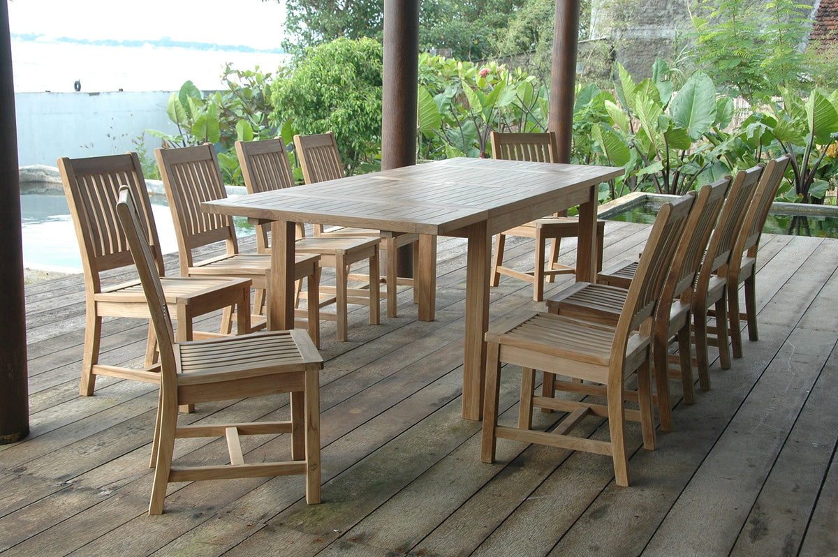 The beautiful all teak design of our Bahama Dining Set features Rialto chairs that have contoured seats and curved back on it that add support and comfort. Our 95" Bahama Rectangular Extension Dining Table measures 55/95" long by 36" wide. It comes with a 2" umbrella hole (to accomodate umbrella) and solid brass plug.