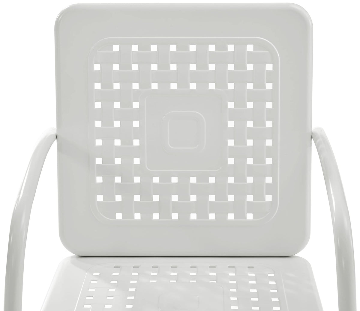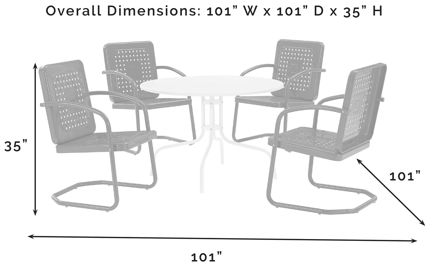 Nostalgia Abounds With The Bates 5-Piece Dining Set. Four Vintage-Style Chairs In Vibrant Colors Surround A Simple Metal Dining Table For A Fun And Functional Outdoor Lounging Experience. Each Chair Features A Square Back With A Unique Basket Weave Design That Allows Air To Circulate. With A Cantilever Base, The Chairs Offer Just Enough Flex For Relaxing While Dining Al Fresco.