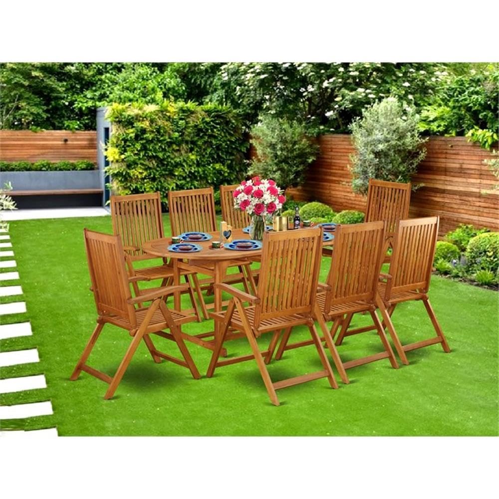 East West Furniture - Bscn9Nc5N - 9 Piece Outdoor Setour Exquisite 9-Piece Outdoor Furniture Set Comprises Of One Patio Dining Table And Eight Multi-Position Chairs, Providing Ample Seating For Up To 6 People. Constructed With The Finest Quality Acacia Wood, This Patio Set Boasts Superior Durability And Endurance. The Oval-Shaped Dining Table Showcases A Unique Design With Distinct Features, While The Folding Patio Chairs Are Sure To Capture The Attention Of Any Onlooker. Ideal For Use With A Rectangular Table, The 5-Position Bistro Chairs Are Designed For Maximum Comfort And Relaxation. Additionally, The Set Features A Convenient Folding Function, Ensuring Easy Storage When Not In Use. Each Chair Offers Five Reclining Positions, Allowing You To Unwind After A Busy Day. The Sturdy Wood Frame Ensures That The Set Maintains Its Aesthetic Appeal Throughout The Seasons, While The X-Style Legs Provide Maximum Stability. This Wood Patio Set Is A Perfect Addition To Your Lawn, Balcony, Or Patio, Adding An Elegant Touch To Your Outdoor Living Space. Cleaning Is Effortless With A Simple Damp Cloth, And The Set Includes Easy-To-Follow Instructions And All The Necessary Tools For A Hassle-Free Installation. By Following The Guidebook, You Can Complete The Assembly Process In A Short Time.Product Features: Material: Acacia Hardwood Outdoor Table Shape: Oval Patio Table Top And Legs Color: Natural Oil Patio Folding Chairs Finish: Natural Oil Outdoor Folding Chairs Back Style: Slatted Back Chair Weight Capacity: 300 Lbs. Outdoor Table Dimensions: Length: 78.70; Width: 35.40; Height: 29.5. Foldable Patio Chairs Dimensions: Length: 29.70; Width: 21.40; Height: 41.20.Package Includes: An Outdoor Bistro Table With 8 Modern Dining Chairs.