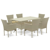 East West Furniture - Osbk7-03A - 7-Piece Outdoor Setthis 7 Piece Outdoor Ensemble Comprises A Glass-Top Table And Six Single Arm Chairs. Enhance Your Patio Dining Experience With This Stylish Wicker Patio Set In A Natural Finish. Crafted With A Lightweight Steel Frame And Covered In Woven Resin Wicker Fiber, This Durable And Weather-Resistant Set Ensures Both Practicality And Ultimate Comfort. The All-Weather Table Features An Elegant Glass Top, Perfect For Placing Snacks, Drinks, Or Decorative Items. Meanwhile, The Accompanying Armchairs With Cushions Are Thoughtfully Designed To Offer Hours Of Comfortable And Relaxing Lounging In Your Outdoor Space. The Cushions Are Water-Resistant, Dustproof, Easy To Clean, And Built To Withstand The Elements. Whether You'Re Planning An Intimate Gathering Or A Delightful Family Dinner, This Contemporary Dining Set Promises A Fantastic Dining Experience In The Fresh Air With Your Loved Ones. Enjoy The Great Outdoors In Style And Comfort With This Outstanding Patio Set.Product Features: Frame Material: Lightweight Steel Outer Material: Pe Wicker Tabletop Material: Glass Color: Natural Cushion Material: Foam Weight Capacity: 300 Lbs Table Dimensions: Length: 60; Width: 36; Height: 30. Chair Dimensions: Length: 24.41; Width: 22.44; Height: 34.25.Includes In The Package: 1 Patio Table And 6 Outdoor Chairs.The Hardware Package And Instruction Manual Are Located In/Under The Seat.