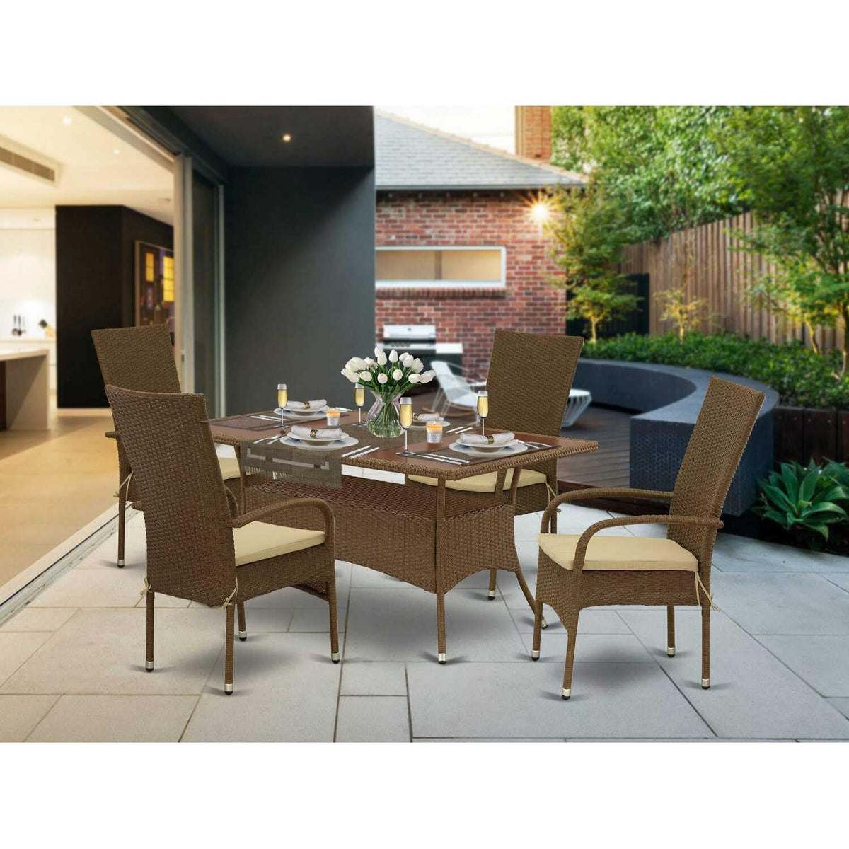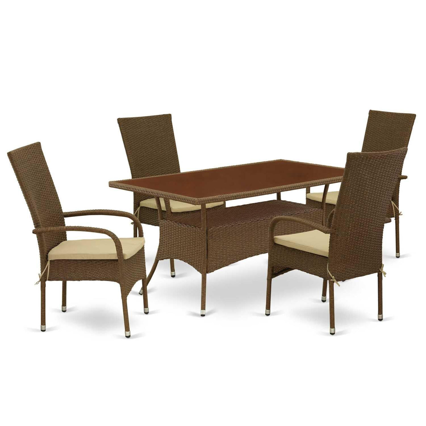 East West Furniture OSOS5-02A 5 Piece Outdoor Patio Conversation Sets Includes a Rectangle Wicker Dining Table with Glass Top and 4 Balcony Backyard Armchair with Cushion, 36x60 Inch, Brown