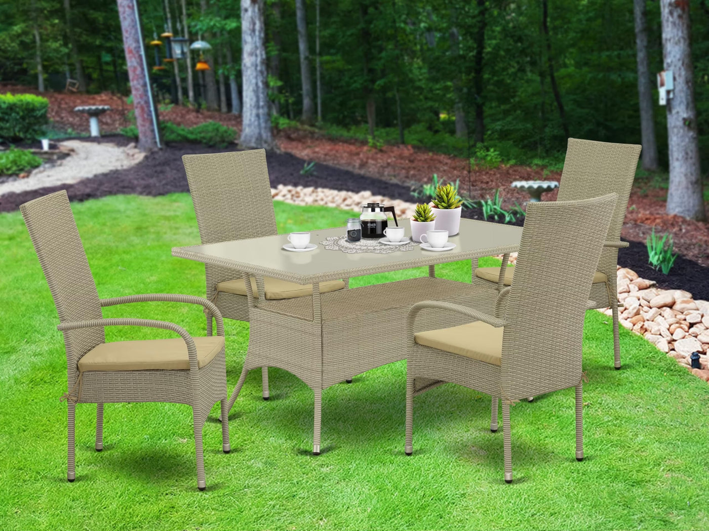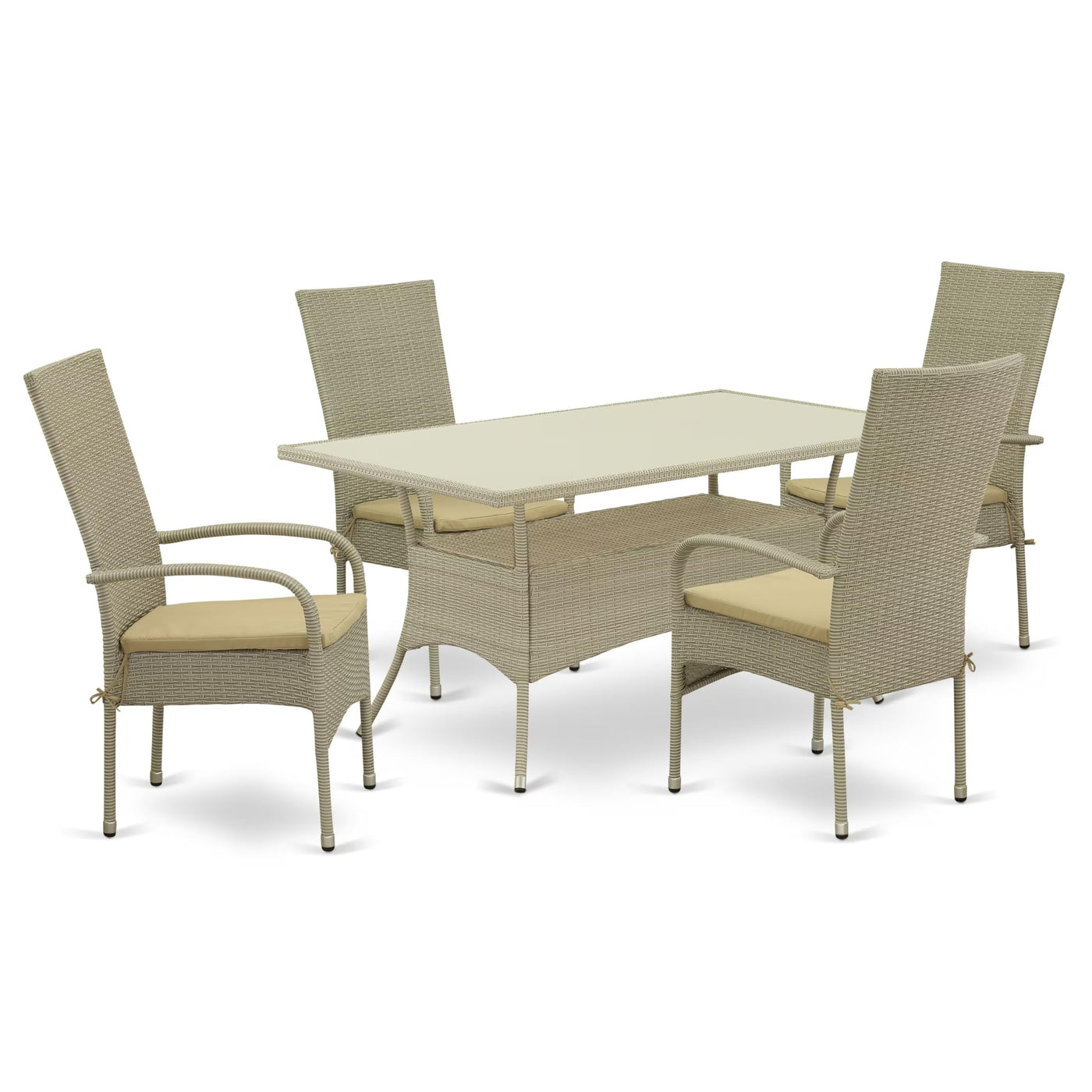 East West Furniture - Osos5-03A - 5-Piece Patio Setintroducing A Stunning 5-Piece Outdoor Ensemble That Will Elevate Your Patio Dining Area. This Set Includes A Beautiful Glass Top Outdoor Table And 4 Comfortable Single Armchairs. Embrace The Elegance Of The Wicker Patio Set With Its Natural Finish, Designed To Enhance Your Outdoor Space. Built With A Lightweight Steel Frame And Wrapped In Durable Woven Resin Wicker Fiber, This Set Is Both Sturdy And Weather-Resistant, Ensuring Long-Lasting Functionality And Ultimate Comfort. The Table, Suitable For All Weather Conditions, Features An Elegant Glass Top, Adding A Touch Of Sophistication While Providing A Convenient Surface For Snacks, Drinks, Or Decorative Items. The Accompanying Armchairs Are Meticulously Crafted With Cushions, Offering Hours Of Relaxation And Comfort In Your Outdoor Oasis. These Plush And Cozy Cushions Are Not Only Water-Resistant But Also Dustproof And Easy To Clean, Ensuring Their Durability Over Time. Be It An Intimate Gathering Or A Delightful Family Dinner, This Contemporary Dining Set Guarantees A Wonderful Dining Experience In The Fresh Air, Creating Cherished Moments With Your Loved Ones. Transform Your Patio Into A Welcoming Space Where You Can Enjoy Memorable Moments And Create Lasting Memories.Specification: Frame Material: Lightweight Steel Outer Material: Pe Wicker Table Top Material: Glass Top Color: Natural Cushion Material: Foam Table Dimensions: Length: 60; Width: 36; Height: 30. Chair Dimensions: Length: 27.17; Width: 22.05; Height: 42.13. Weight Capacity: 300 Lbspackage Includes: 1 Outdoor Table And 4 Patio Chairs.The Hardware Package And Instruction Manual Are Located In/Under The Seat.