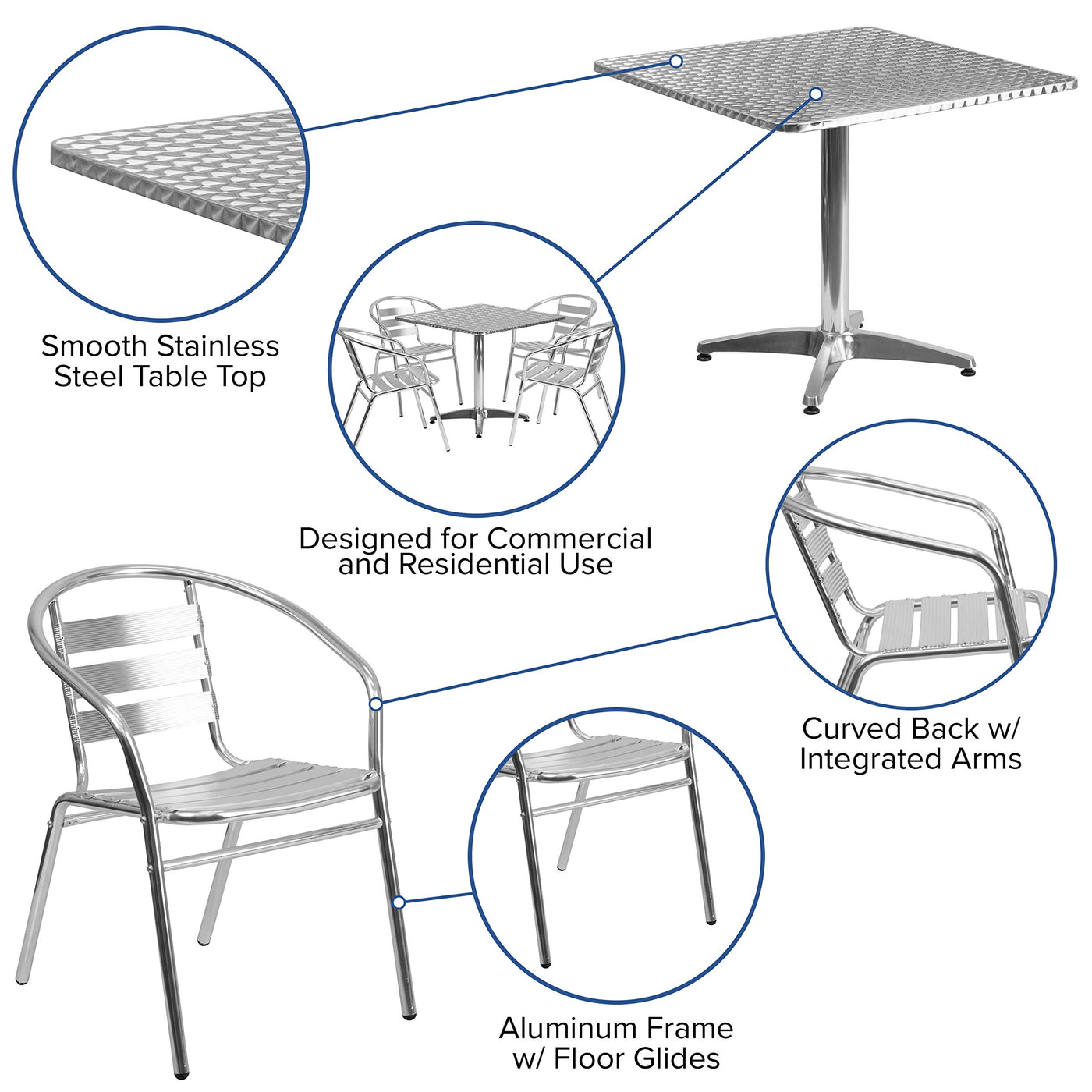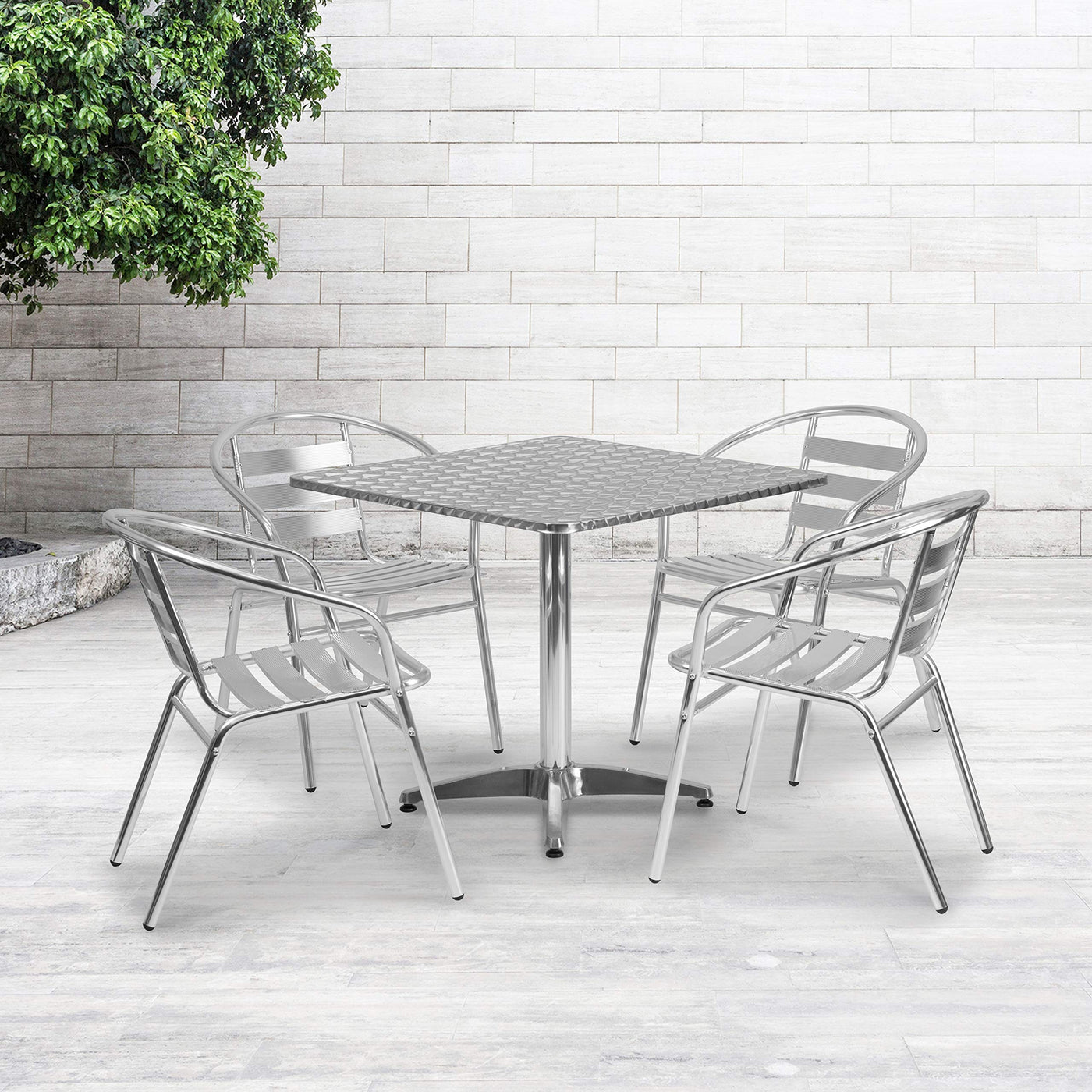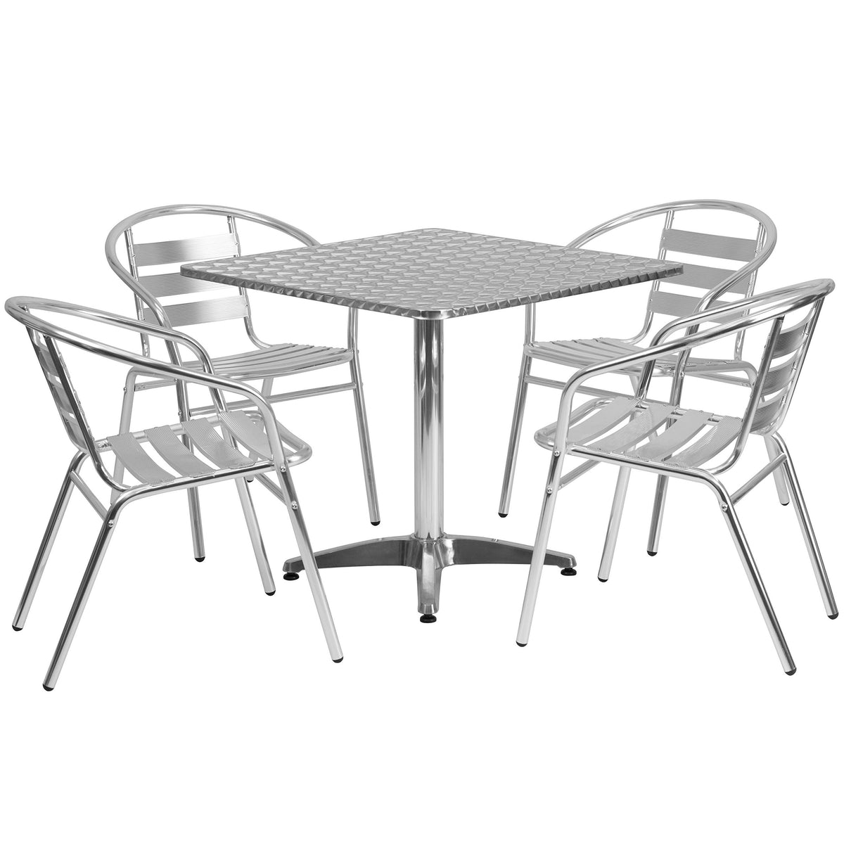 If you love hosting family and friends on your deck or need extra seating for the new dining patio of your cafe, this square table and 4 chair set is just what you need. The table's stainless steel designer top has a smooth surface for keeping items level. The column and base are constructed of lightweight aluminum material. The lightweight chairs feature a curved triple slat back, textured seat and integrated arms. Cross braces provide extra stability when sitting and these sturdy chairs hold up to 352 lb. weight capacity. For easy storing and cleaning purposes these chairs stack up to 4 high. This set was designed for all-weather use making it a great option for indoor and outdoor settings. For longevity, care should be taken to protect from long periods of wet weather. Whether you are just starting your business, expanding your "al fresco" seating or springing for the outdoor kitchen you've always wanted, this set will give you the perfect look.