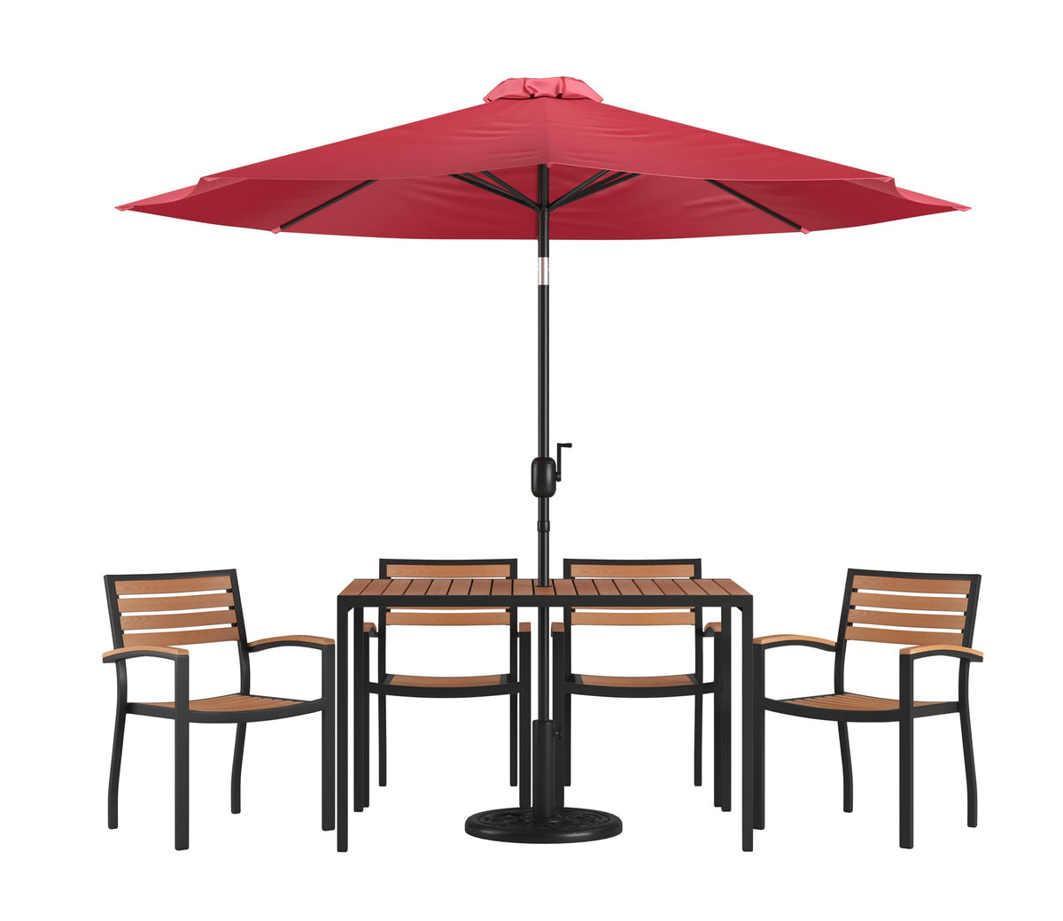 Flash Furniture Lark 7 Piece Outdoor Patio Dining Table Set - 4 Synthetic Teak Stackable Chairs with Arms - 30" x 48" Table - Red Umbrella with Base