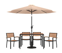 Flash Furniture Lark 7 Piece Outdoor Patio Dining Table Set - 4 Synthetic Teak Stackable Chairs with Arms - 30" x 48" Table - Tan Umbrella with Base