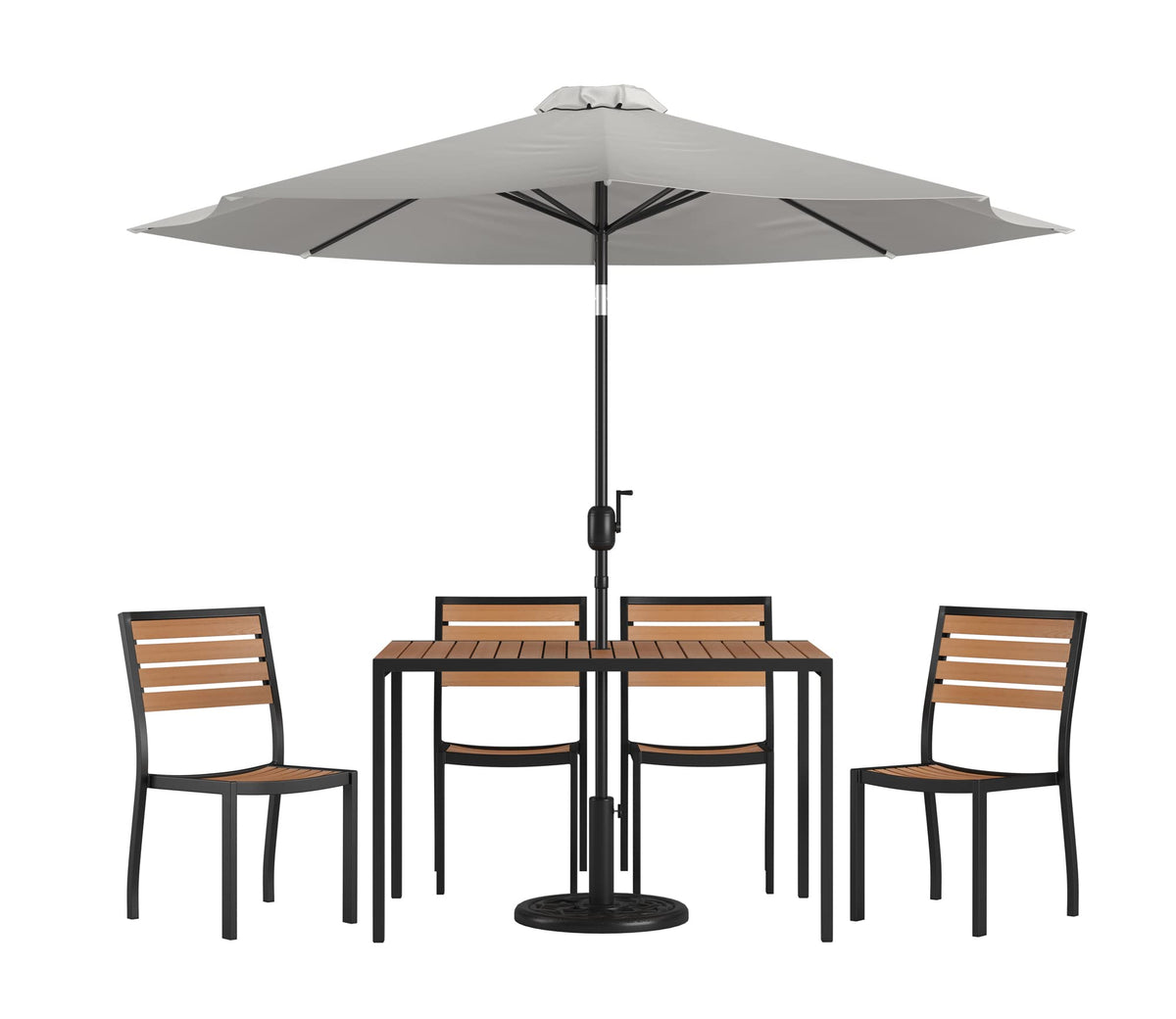 Flash Furniture Lark 7 Piece Patio Table Set - 4 Synthetic Stackable Faux Teak Chairs - 30" x 48" Faux Teak Table - Gray Umbrella with Base