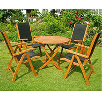 Add A Touch Of Style And Comfort To Your Outdoor Furnishings With This Five Piece Dining Set. Features A Folding Round Table (36 X 36 X 30) With A Place For An Umbrella, And Four Folding Chairs (24W X 28D X 44H) That Have Five Positions For Maximum Versatility And Personalized Comfort. Seat And Back Are Made From Text Ilene. Made For Belau Wood For Strength And Durability. Will Fold For Easy Storage.