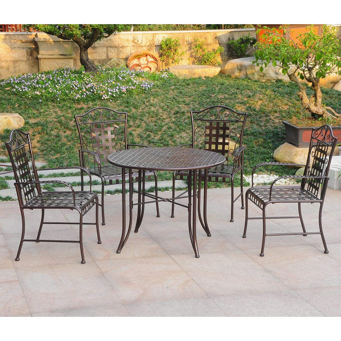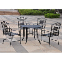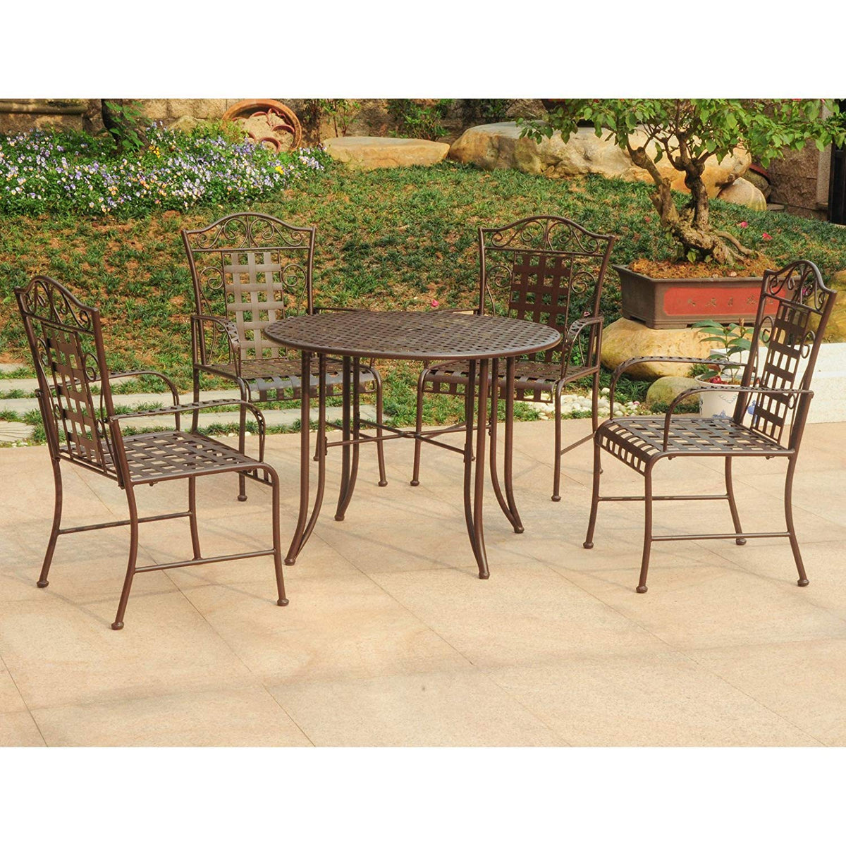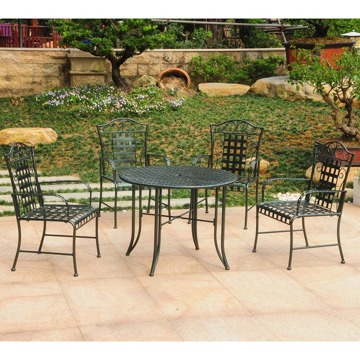 Add A Touch Of Class To Your Patio With This Iron Patio Set. Carved Beautifully With Classic Lattice And Scrollwork Detailing. Constructed From Iron For Strength And Durability. Powder Coated Finsih To Resist The Elements. Comes With A Table With An Umbrella Hole (39 W X 29H) And Four Chairs (27L X 22W X 40H).