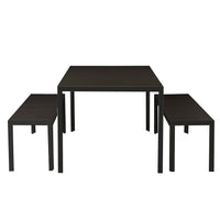 Sleek Modern 3 Piece Dining Set. This Set Consist Of 2 Benches And One Dining Table. Benches Fit Under Dining Table For Storage. Thickness Of Dining Table Top Is 2 Inches Distance Between The Two Legs Width: 32 Distance Between The Two Legs Length: 55