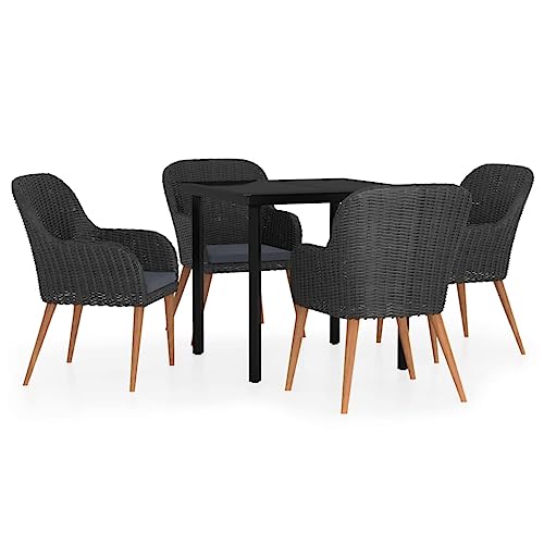 vidaXL 5-Piece Patio Dining Set | Outdoor Furniture Set with Cushions, Glass Tabletop | Black Poly Rattan and Powder-Coated Steel Frame
