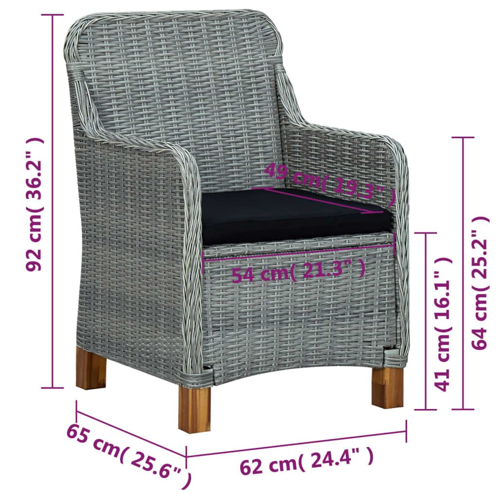 This patio table is made of solid acacia wood, making it sturdy and stable. The oil-finished surface also makes the table easy to clean with a damp cloth. Additionally, the curved legs contribute to its stylish design. Featuring a steel frame covered with weather-resistant PE rattan, these dining chairs are sturdy and easy to clean. The thickly padded cushions add comfort in your lounging time.