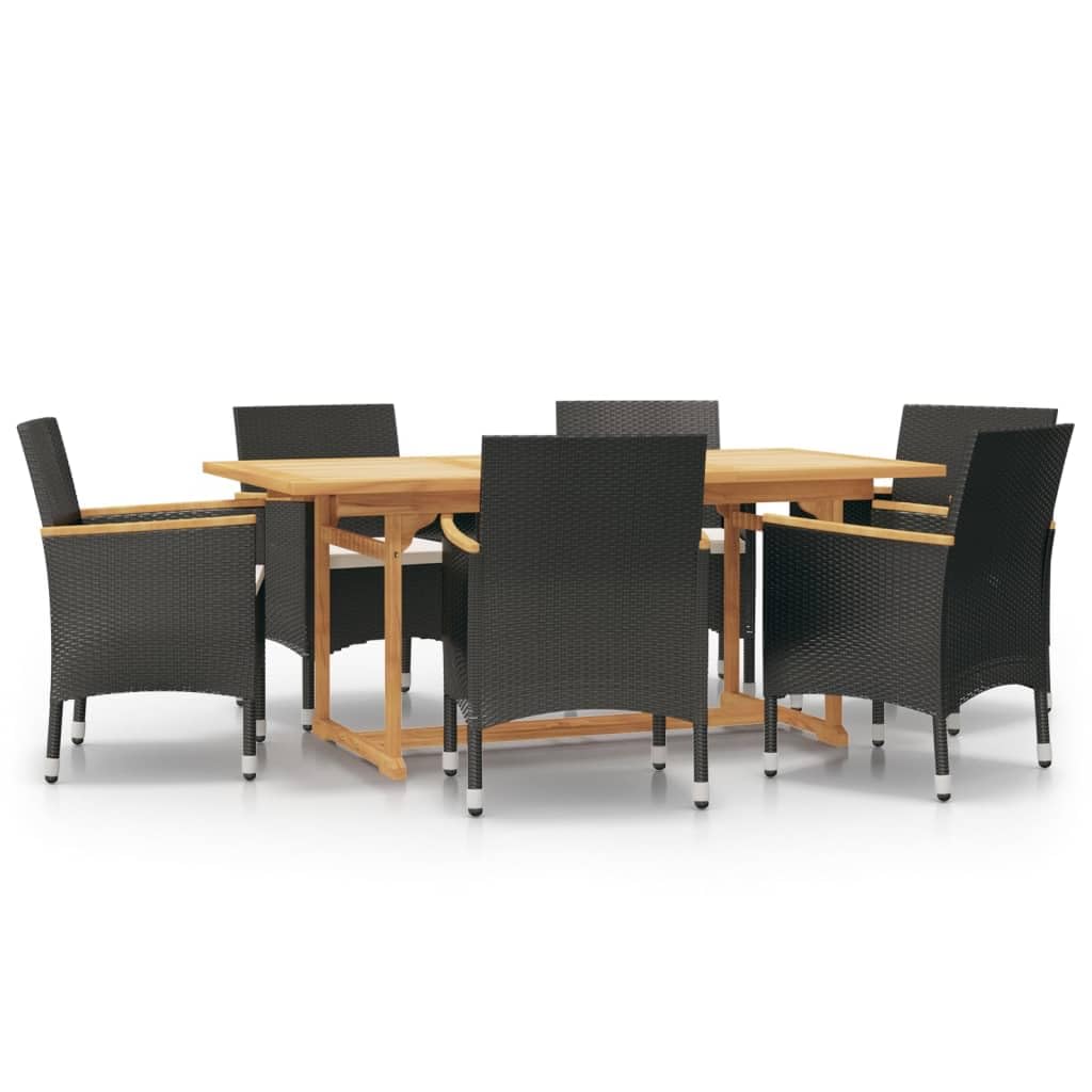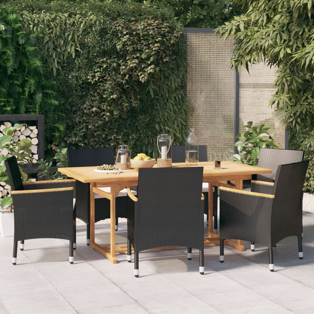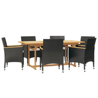 vidaXL 7 Piece Black Patio Dining Set with Cushions - Solid Acacia Wood Table and PE Rattan Chairs with Cream White Polyester Cushions - Outdoor Furniture for Garden, Yard, or Terrace