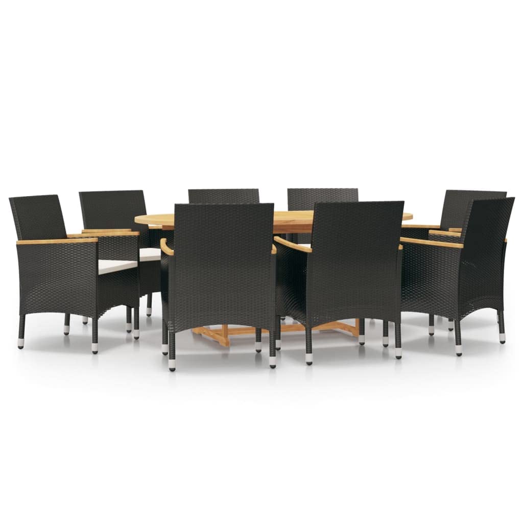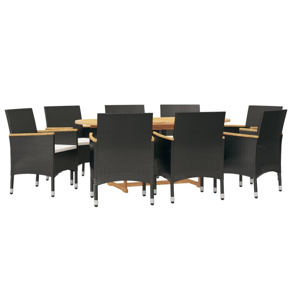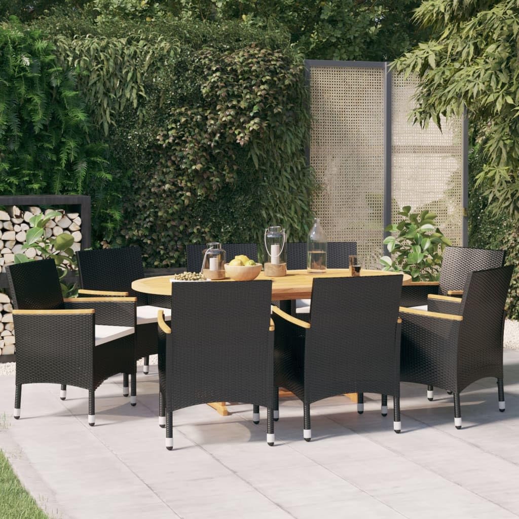 vidaXL 9-Piece Outdoor Patio Dining Set, Solid Acacia Wood Construction, Comfortable Design with Cushions, Parasol Accommodating Table, Sleek Black PE Rattan Chairs
