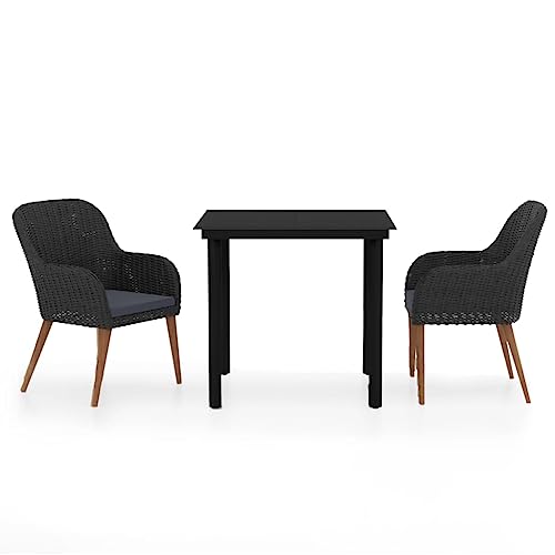 vidaXL Black Patio Dining Set - 3 Piece Outdoor Furniture Set with Cushions - Poly Rattan, Powder-Coated Steel, Solid Acacia Wood, Glass with Removable & Washable 100% Polyester Covers