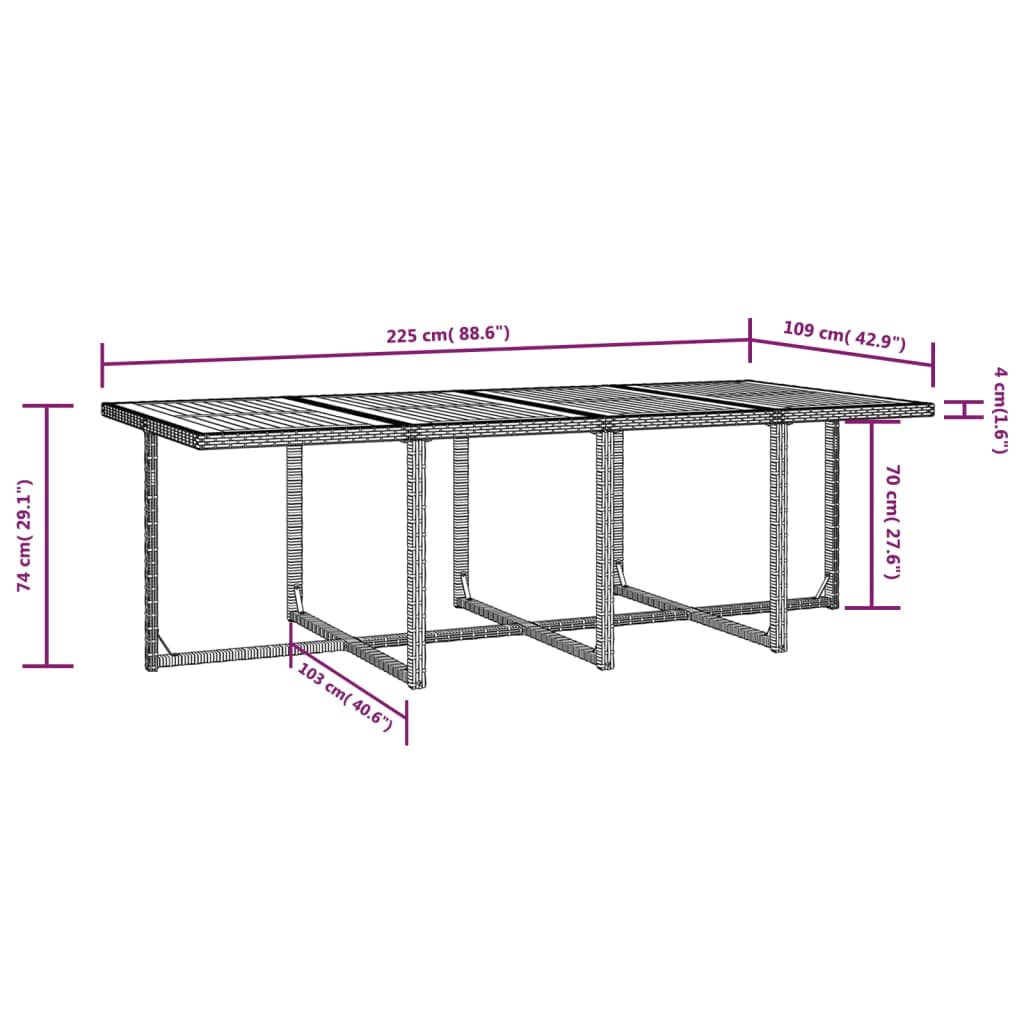 Note 2): This item will be shipped flat packed. Assembly is required; all tools, hardware and instructions are included. Rattan color: Black Cushion color: Cream white Material: Steel frame + PE rattan + acacia hardwood tabletop with natural oil finish Cushion material: Polyester cover with foam filling Table dimensions: 89" x 43" x 29" (L x W x H) Chair dimensions: 20.5" x 22" x 33.5" (W x D x H) Seat depth: 15.7" Seat width: 18.3" Seat height from the ground: 17.3" Armrest height from the ground: 26.4" Stool dimensions: 16" x 16" x 13.8" (W x D x H) Cushion thickness: 2" Cushion covers are removable Delivery includes: 1 x Table 8 x Chair 4 x Stool 20 x Cushion WARNING Cushion and pad are only for outdoor use. Do not take them inside of dwelling
