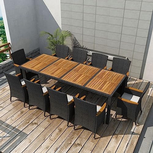 Our stylish rattan garden furniture set will become the focal point of your garden or patio! This dining set, with an elegant design, will be a great choice for al fresco dining or relaxing in the garden. The powder-coated steel frames make the table and chairs strong and sturdy, and thanks to their lightweight construction, all items are easy to move. Made of weather-resistant, waterproof PE rattan, the dining set is easy to clean. The tabletop and chair armrests are made of acacia wood, a tropical hard wood, which is weather-resistant. The thick, soft, foam-filled seat cushions are highly comfortable and made of water-repellent polyester. The removable and washable covers are equipped with zips. Delivery includes 1 table, 10 chairs and 10 cushions. Note 1): We recommend covering the set in the rain, snow and frost.Note 2): This item will be shipped flat packed. Assembly is required; all tools, hardware and instructions are included.