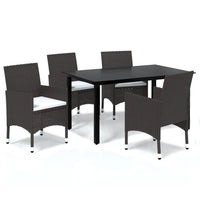 3094993 vidaXL 5 Piece Patio Dining Set with Cushions Poly Rattan Brown This garden dining set is a perfect combination of style and functionality and is meant to be the focal point of your garden, balcony or patio. Sturdy steel frame wrapped with weather-resistant PE rattan, the garden chairs are rust proof, providing years of quality relaxation. The outdoor table features a glass tabletop with simple lines, which is easy to clean and suitable for outdoor use. The aluminum frame also ensures stability and sturdiness. Additionally, the thickly padded cushions provide ultimate comfort during your sitting time. This patio dining set is easy to move with the lightweight construction. Note: In order to extend the life of your outdoor furniture, we recommend you to clean it regularly and do not leave it outdoors without protection unnecessarily.Clean: Use a mild soap solution.Storing: If possible, store in a cool, dry place indoors. If the product is stored outdoors, protect it with a waterproof cover. Wipe and dry the excess water or snow from flat surfaces after a rain or snowfall. Allow sufficient air circulation to avoid moisture-related damage.