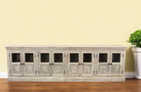 118'' White Solid Wood Distressed Sideboard with 8 Glass Doors