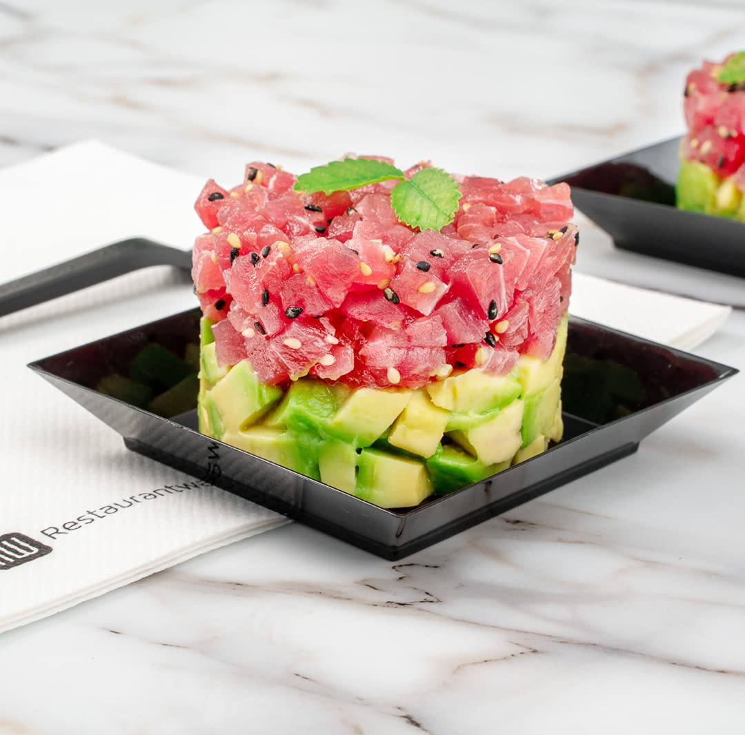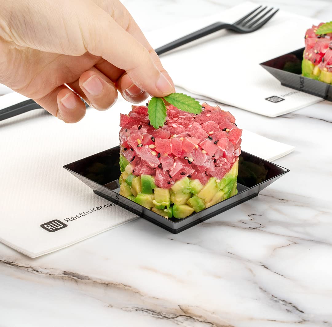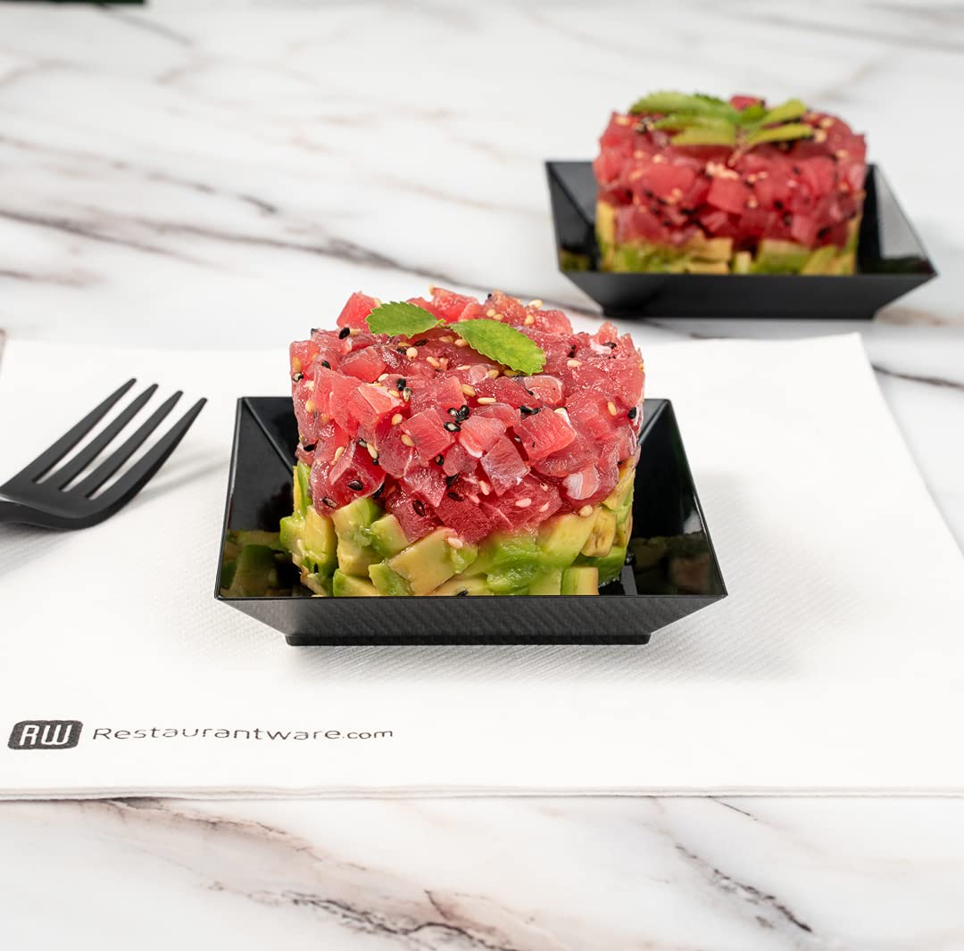 Artfully Plate Unique Appetizers Using Our Square Black Plastic Small Modern Plates. Perfect For Catering Events, Banquets, Or Restaurants, These Sturdy Disposable Plates Are Made From High-Quality Plastic And Are Recyclable For An Easy And Eco-Friendly Cleanup. Featuring A Squared Design And Glossy Black Finish, These Square Appetizer Plates Add A High-End Look To Small Servings Of Stuffed Dates, Canapes, And Tarts. The Raised Edges Of These Black Plastic Plates Are Ideal For Mess-Free Serving. To Keep Dishes Intact And Stop Spills, These Disposable Plates Are Crack-Resistant And Leak-Resistant. These Square Appetizer Plates Can Be Stacked Together For Easy Space-Saving Storage. Measuring 3.9 Inches In Length By 3.9 Inches In Width, These Black Plastic Plates Are Sold In A 100 Count Box.