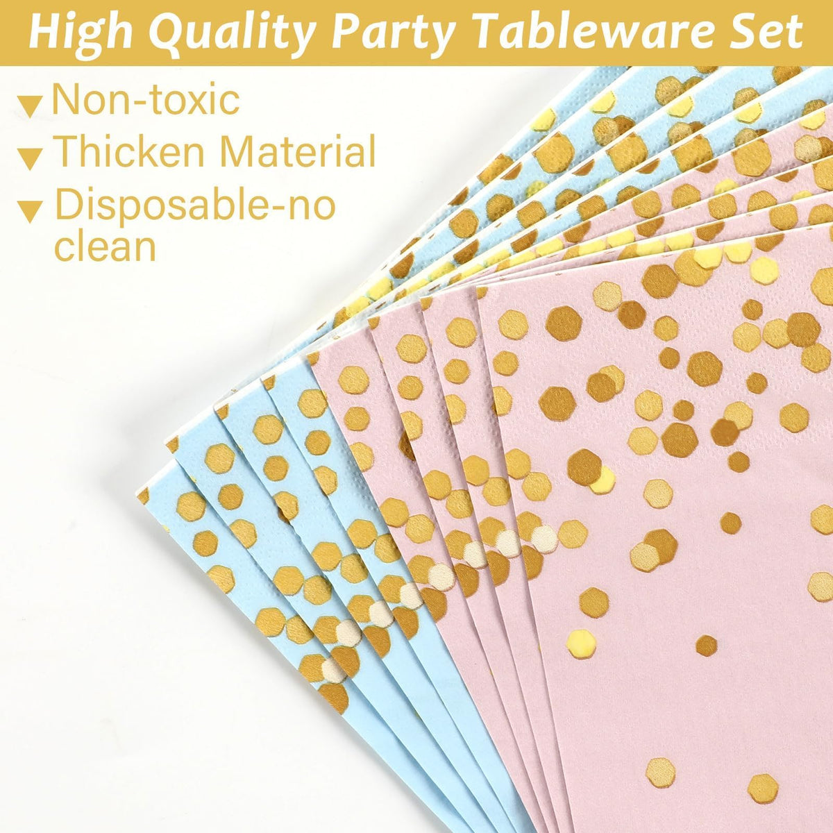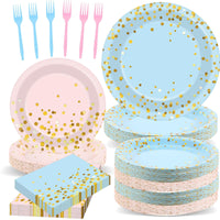 Q: What colors are included in this gender reveal set?A: The set features a vibrant blue and pink color scheme with a gold dot design, making it perfect for a gender reveal party celebrating both boys and girls.