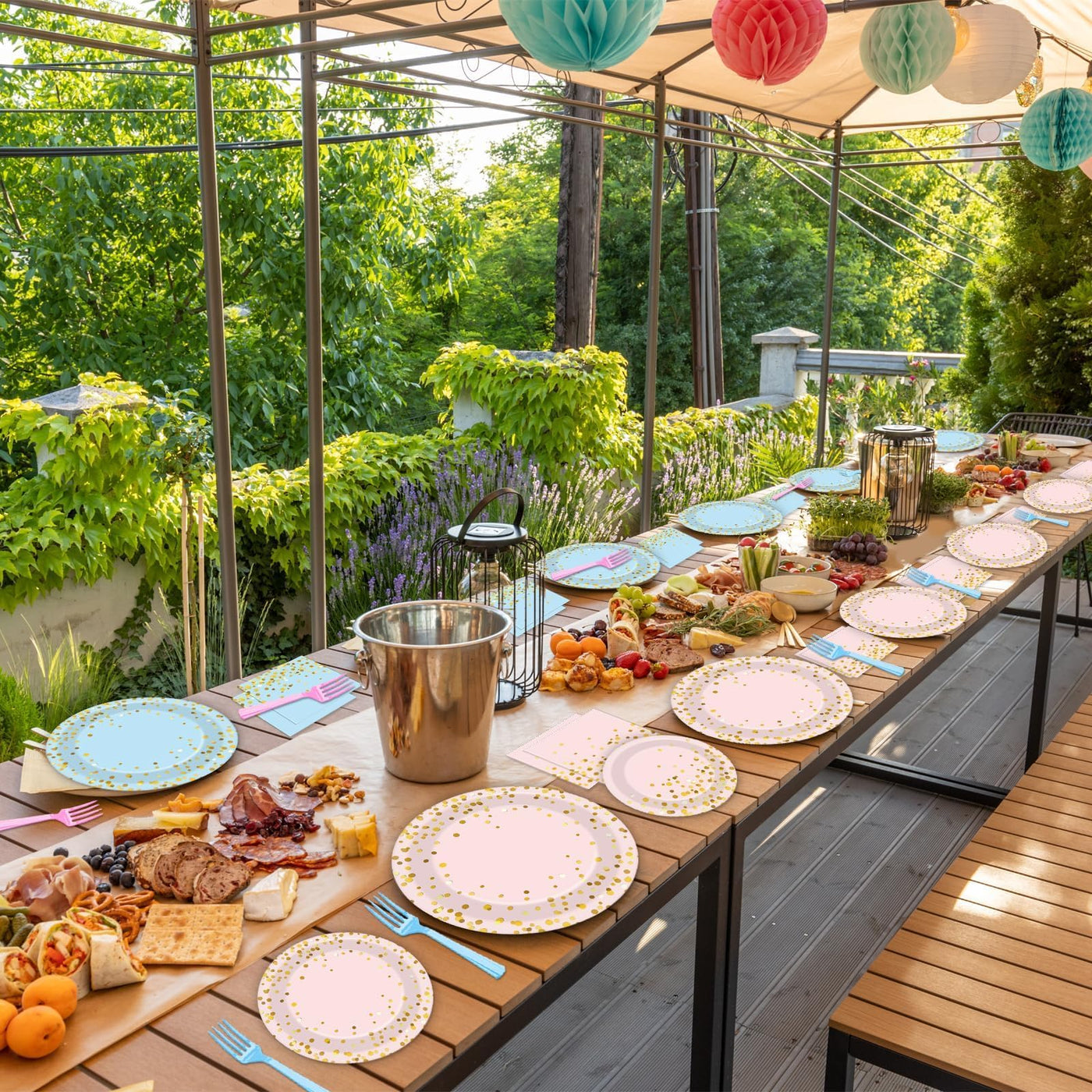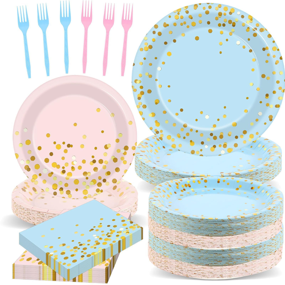 200Pcs Blue And Pink Party Gender Reveal Suppliess For 50 Guests Gender Tableware Set Golden Dot Disposable Paper Plates Plastic Forks Napkins For Boys And Girls Decorations Baby Shower Birthday Pink And Blue Gender Reveal Party Supplies:You Will Receive 50 Pieces Pink Gold Dot Party Paper Dinner Plates Of 9&Rsquo;&Rsquo;, 50 Pieces Plates Of 7&Rsquo;&Rsquo;, 50 Pieces Pink Birthday Napkins Of 6.5&Rsquo;&Rsquo; And 50 Plastic Gold Forks For Each Set That Can Serve 50 Guests.Premium Material:All Of Our Pink And Blue Theme Plates And Napkins Are Made Of Quality Paper, Non-Toxic, No Smell, Heat-Resistant And Durable. The Pattern And Color Are Well-Printed And Fade-Resistant To Provide You With A Party That Full Of Happy Birthday Atmosphere.Specifications:Material: Papersize: 9&Rsquo;&Rsquo; For Large Size Plates; 7&Rsquo;&Rsquo; For Small Size Plates;6.5&Rsquo;&Rsquo; For Napkinscolor: As The Picture Shownpackage Includes:50X 9&Rsquo;&Rsquo; Plates50 X 7&Rsquo;&Rsquo; Plates50 X Napkins50 X Forks