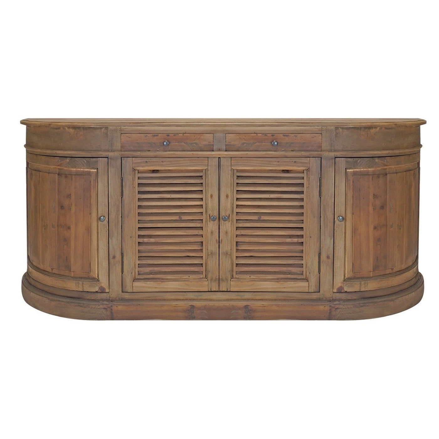 Bring home this stylish serving buffet cabinet sideboard console for a kitchen or dining room accent that is as versatile as it is beautiful. It features two smooth gliding drawers for small kitchen essentials while the spacious cabinet in the middle keeps a spacious storage area behind two gorgeous shuttered doors for a easy, effortless, and gorgeous way to compartmentalize your family dinners.