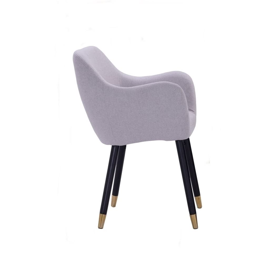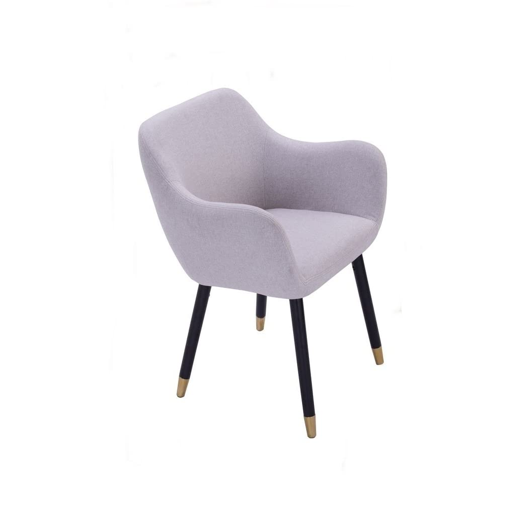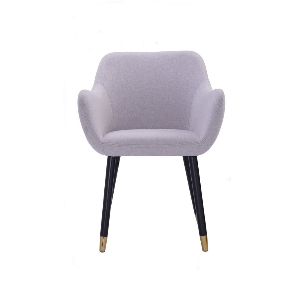 Ailin Dining Armchair Material/Color: Fabric (100% polyester) in grey goose color ; Solid wooden legs in black with gold metal foot capsDimensions: W 62cm x D 57.5cm x H 83cm Seat Height 47cmGray Upholstered Dining Chair