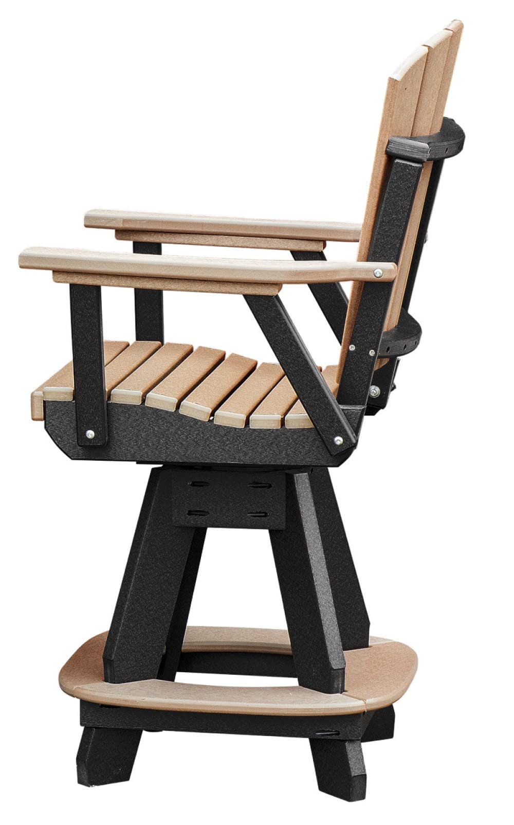 Enjoy our patio and outdoor furniture assortment for years and years. This heavy duty round counter height table and counter height fanback swivel arm chairs feature our Cedar colored seat and back on a black base. Every item is made of high-density recycled poly resin infused with UV stabilized colored plastic. This material is UV fading resistant, water resistant, extremely durable and built to last. All hardware is made of stainless steel and our swivel mechanism is made in the USA. Proudly made by the Amish community in Indiana, United States.