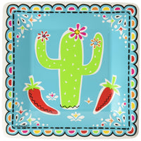 Q: What designs can I expect on the plates?A: The plates feature a vibrant design with cacti and red chili peppers against a colorful blue background, adding a festive touch to any occasion.