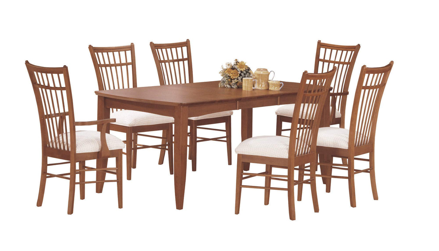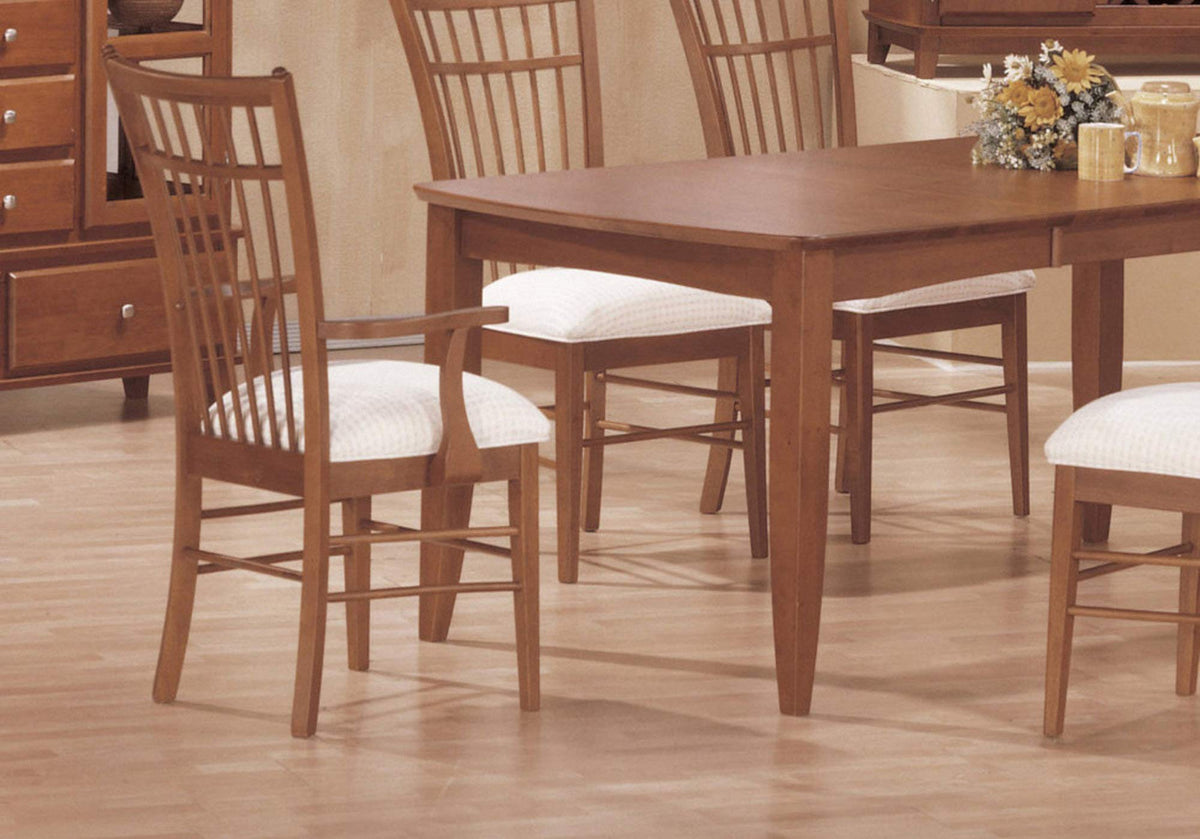 Add this stylish set of 2 dining armchairs with a cage-style high back to your formal dining space. These solid wood dining chairs are finished in a rich amaretto and upholstered in a cushioned durable off-white micro-fiber fabric. These chairs are versatile to use as dining chairs, accent/guest chairs, or even to pair it with a desk for an elegant look.Features Includes a set of 2 arm chairsComfortably padded off-white microfibre upholstered seatsHigh back cage style back rest for a less formal look in a dining roomWarm amaretto finishTransitional style designStyle: TransitionalColor: CherryMaterial: Solid Wood,Upholstered,Micro-FiberProduct Size: 20'L x 21'W x 42'HMade In Malaysia