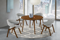 The Arcadia and Talulah 48 '' Round Grey and Walnut Wood 5 Piece Dining Set is the perfect modern addition to any kitchen or dining room. This 5-piece dining set will open your dining room with its clean, round table and modern chairs. Meticulous craftsmanship and expert design have gone into the creation of this dining set, which is as functional as it is stylish. Hints of Scandinavian design and a mid-century modern feel come together to create the perfect space to share a meal with friends and family. The open-back design of the Talulah dining chair offers breathable seating, combined with the soft foam padded cushion - this chair will make you want to stay seated all day long. The rich fabric is alluring and authentic, looking great and performing well is what we want to offer to our customers every time. The Arcadia and Talulah Round 5 Piece Dining Set is available in your choice of a Black or Walnut Wood Finish with Grey upholstered Talulah chairs and are available as a 42 or 48 set.