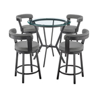 Take Dining Or Entertaining To The Next Level With The Naomi And Bryant Counter Height Dining Set From Armen Living. The Naomi Is A Contemporary Bar Table That Adds A Touch Of Pure Sophistication To A Kitchen, Bar, Or Lounge Area, Or Even A Breakfast Nook. It Features A Strong And Striking Black Metal X-Shaped Base, Giving It A Sleek And Stunning Visual. The Bryant Metal Bar Stools Were Crafted With A Durable Frame; Easy To Take Care Of And Clean, This Stool Will Give You Excellent Use For Years To Come. The Faux Leather Upholstery Is Luxuriously Wrapped Around The High-Density Foam Cushions Of This Barstool, Adding Yet Another Comfortable Feature. The Bryant Also Features A Convenient Metal Footrest, As Well As A 360-Degree Swivel Mechanism That Maximizes Mobility For You And Your Guests. This 5-Piece Set Includes 4 Stools And 1 Round Table. The Naomi And Bryant Dining Set Has A Black Metal Finish, Glass Tabletop, And Grey Faux Leather Upholstery. The Bryant Stools Have A 26-Inch Seat Height And Can Support Up To 250Lbs Per Seat.