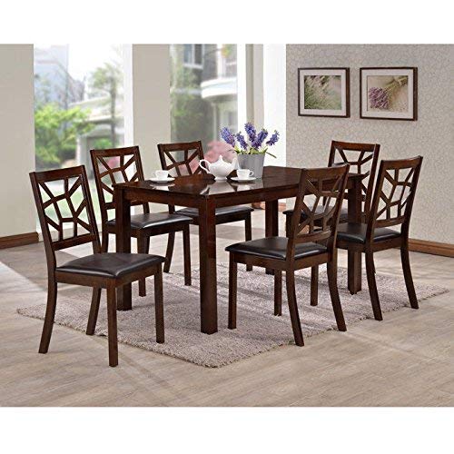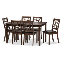 Showcasing dazzling mosaic-like chair-back designs, our Mozaika Wood and Leather Contemporary 7-Piece Dining Set certainly has something to say. But the transparently trapezoidal backrest slats represent only part of this contemporary dining set’s charm. Black faux-leather seats combine with dark-brown stain wood to make a timeless statement. This seven-piece set features six chairs and a sturdy table for years of use.
