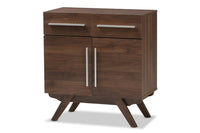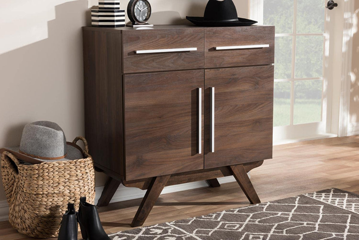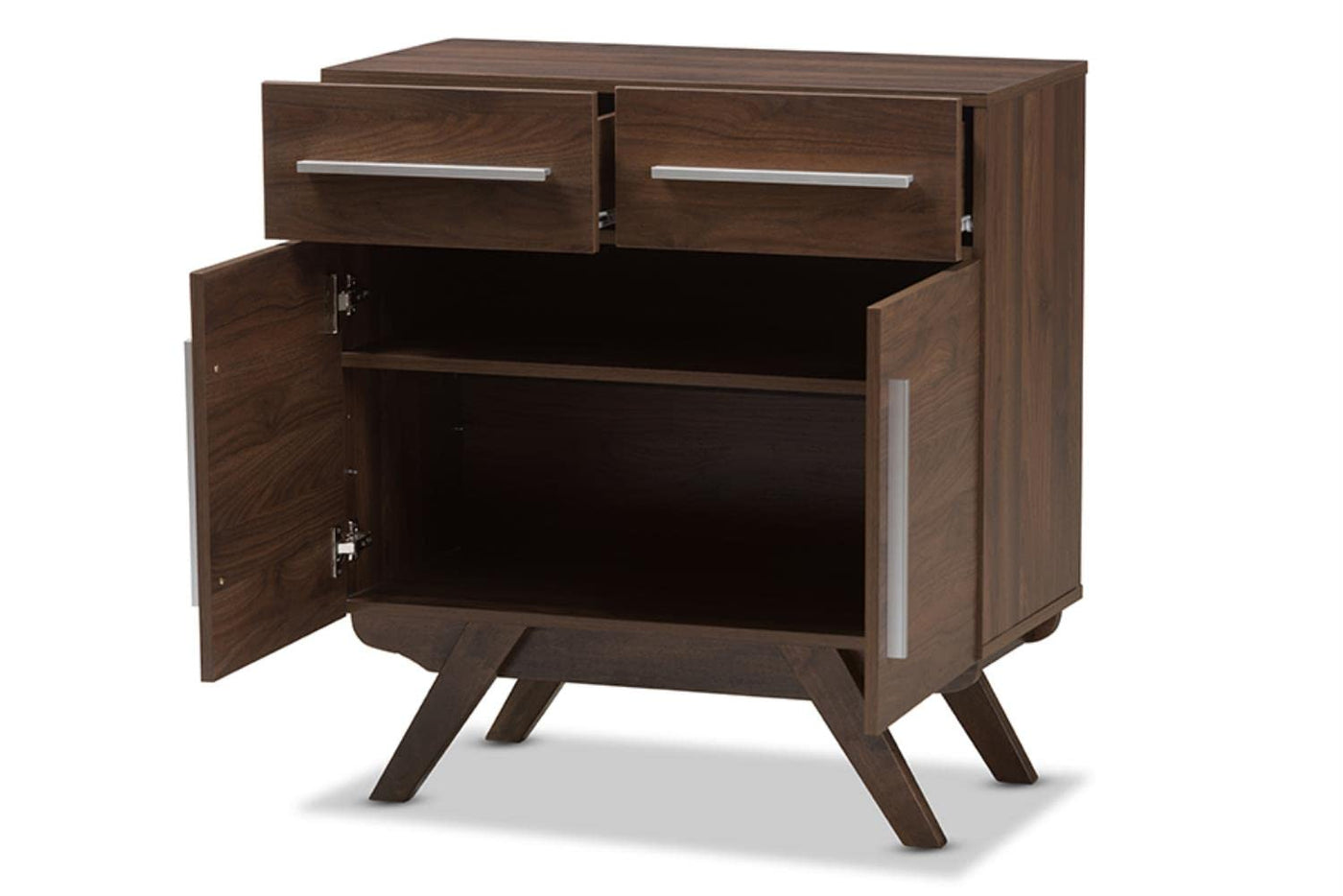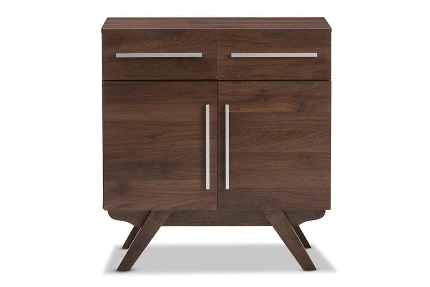 Sleek design with angular legs for sculptural design balancing the Ashfield sideboard presents your everyday space with ample storage Constructed of engineered wood and MDF boards for sturdiness the sideboard features two drawers and two compartments with door for handy storage to stash knickknacks in your living or dining area Powdercoated handle offers a sleek and modern aesthetic in your space Solid rubberwood legs provide strong structural supports Walnut or espresso brown veneered finishing complements a range of interior palettes and styles from retro and Scandinavian to coastal and urban styles Made in Malaysia the Ashfield requires assembly Features. Midcentury sideboard. Two drawers. Two compartments with doors. Made in Malaysia. Assembly requiredSpecifications. Finish Walnut brown finishing. Dimensions 336H x 3126W x 1587D. Shelves 817H x 2996W x 1437D. Drawers 465H x 1268W x 1211D. Legs 878. Weight 7789 lbs