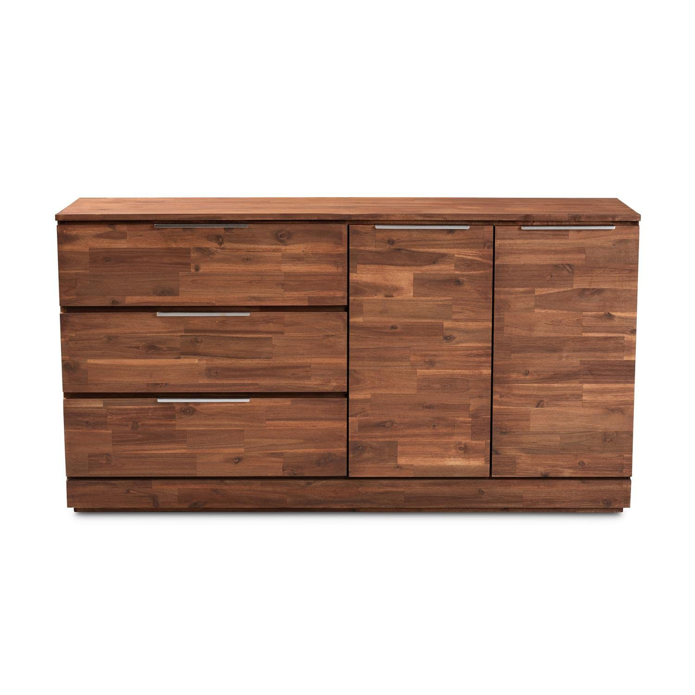 Enhance your dining room with the rich wood tones of the Austin sideboard. This modern sideboard features three drawers and two concealed shelves with space to store plates, silverware, and more. The drawers and doors are fitted with slim silver metal handles for cool, minimalist appeal. Built from acacia wood and rubberwood, the Austin features a stunning caramel brown finish that highlights the various tones in the wood. The Austin dresser is made in Malaysia and arrives fully assembled. Features Modern and contemporary sideboardConstructed from acacia wood and MDF woodCaramel brown finishThree drawers and two (2) shelvesSilver metal drawer pullsFully assembledMade in MalaysiaSET INCLUDES: One (1) ServerFULL DIMENSIONS: Dimensions: 33.5' High x 63' Wide x 16.5' Deep; Drawers: 5.51' High x 28.43' Wide x 13.78' Deep; Shelves: 14.45' High x 30.35' Wide x 11.81' DeepASSEMBLY: Fully AssembledSTYLE: ContemporarySERIES: SelectPRODUCT COMPOSITION: Engineered WoodPRIMARY FRAME: Engineered WoodCOLORS AND FINISHING: Golden OakFINISHING: Golden Oak
