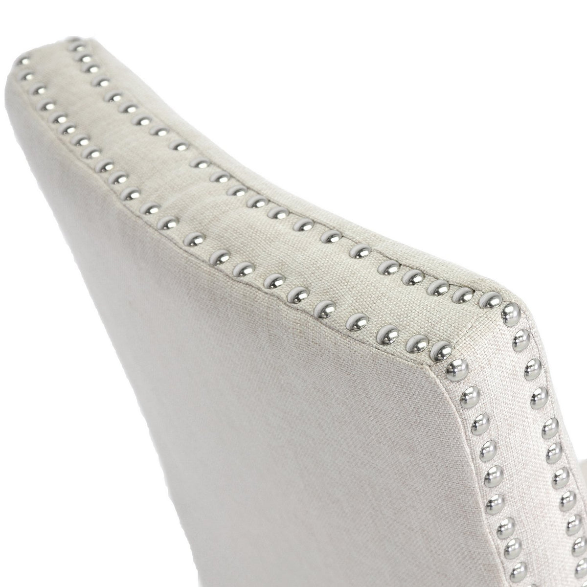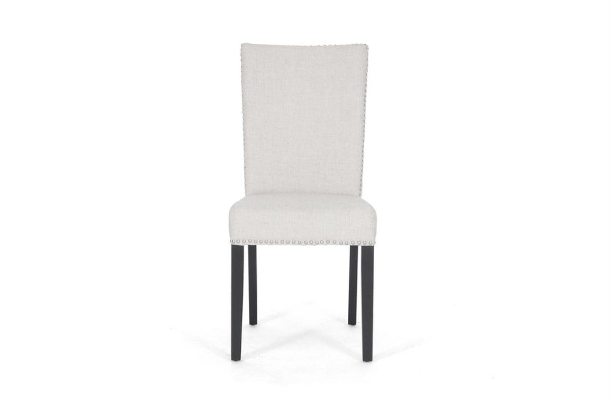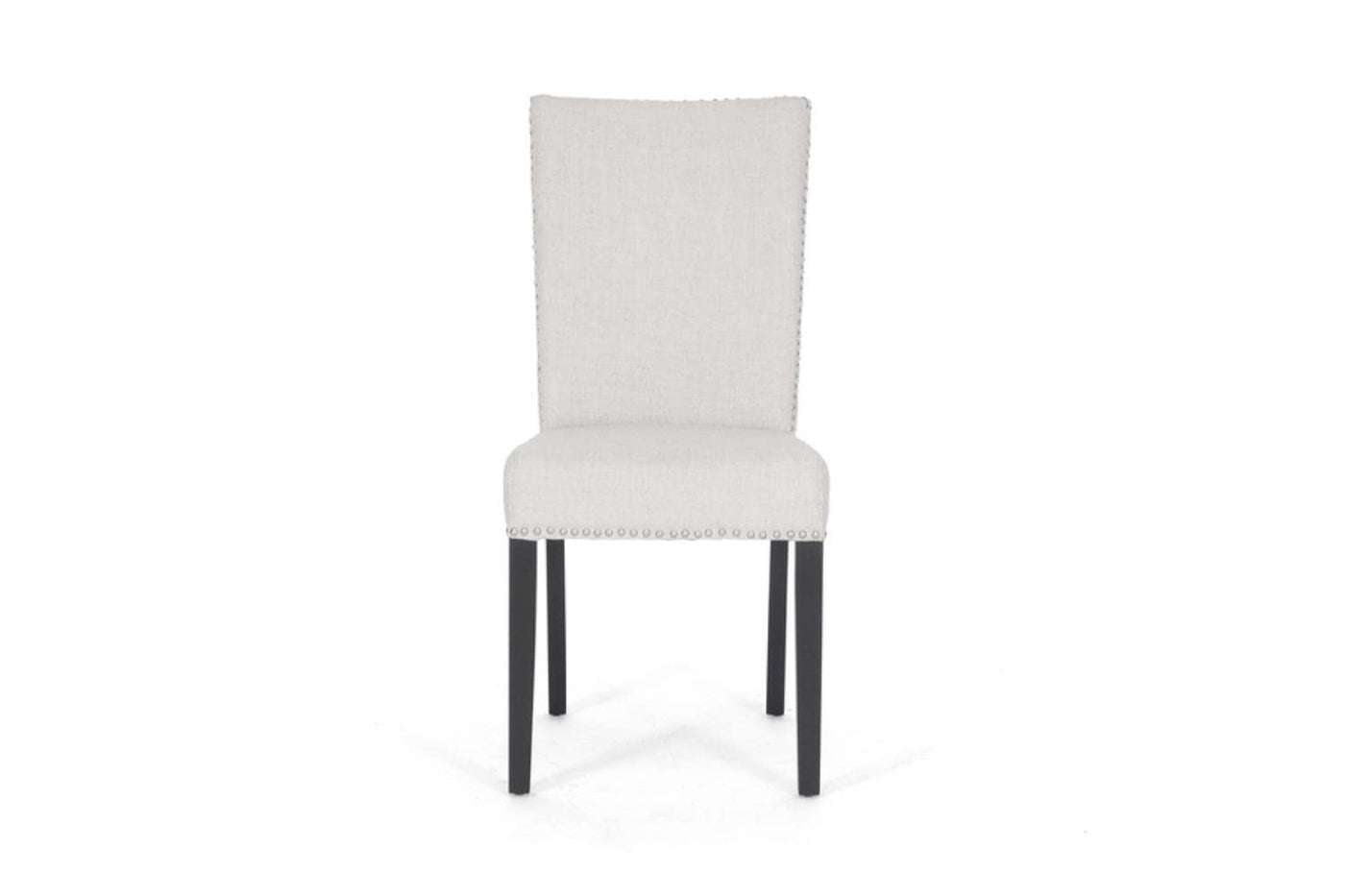o frills, no fuss, but plenty of fashion! The simplistic Harrowgate Dining Chairs have the straight line-inspired design of popular modern style but a comforting beige linen upholstery and traditional silver nail head trim along most outer edges. The chairs are made with birch wood frames and foam cushioning (CA117 flame retardant). Completing your new dining room furniture set are black lacquer legs with non-marking feet. Made in China, the modern chairs should be spot cleaned.