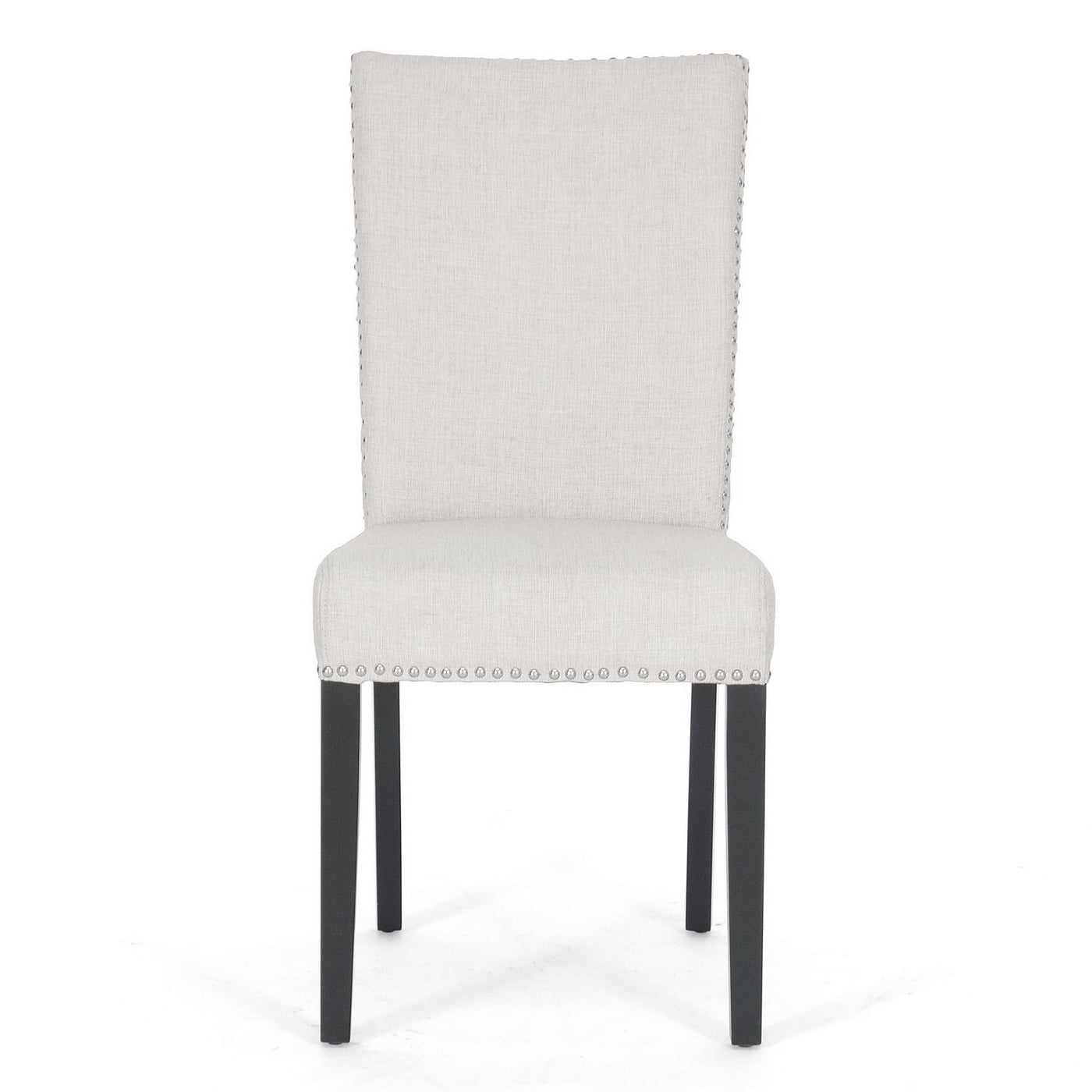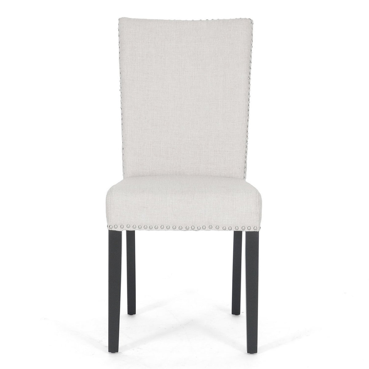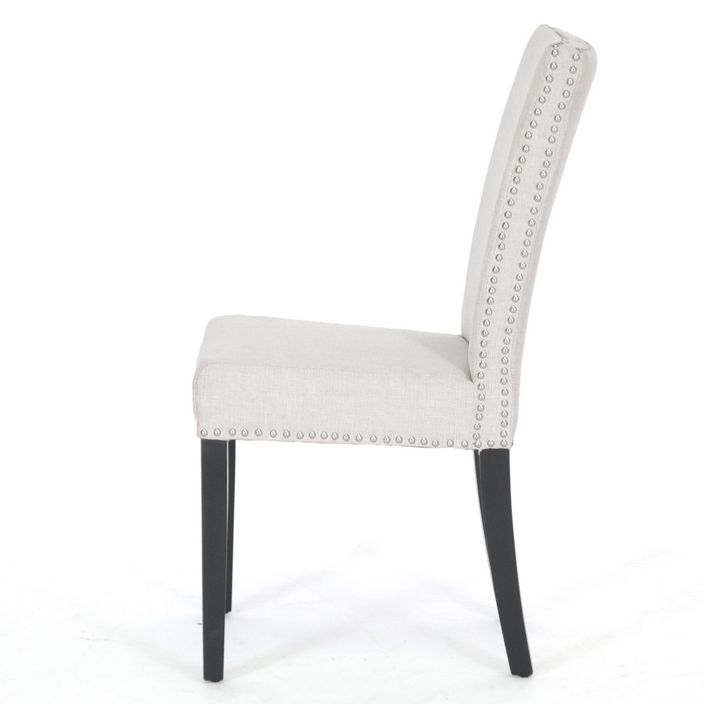 o frills, no fuss, but plenty of fashion! The simplistic Harrowgate Dining Chairs have the straight line-inspired design of popular modern style but a comforting beige linen upholstery and traditional silver nail head trim along most outer edges. The chairs are made with birch wood frames and foam cushioning (CA117 flame retardant). Completing your new dining room furniture set are black lacquer legs with non-marking feet. Made in China, the modern chairs should be spot cleaned.
