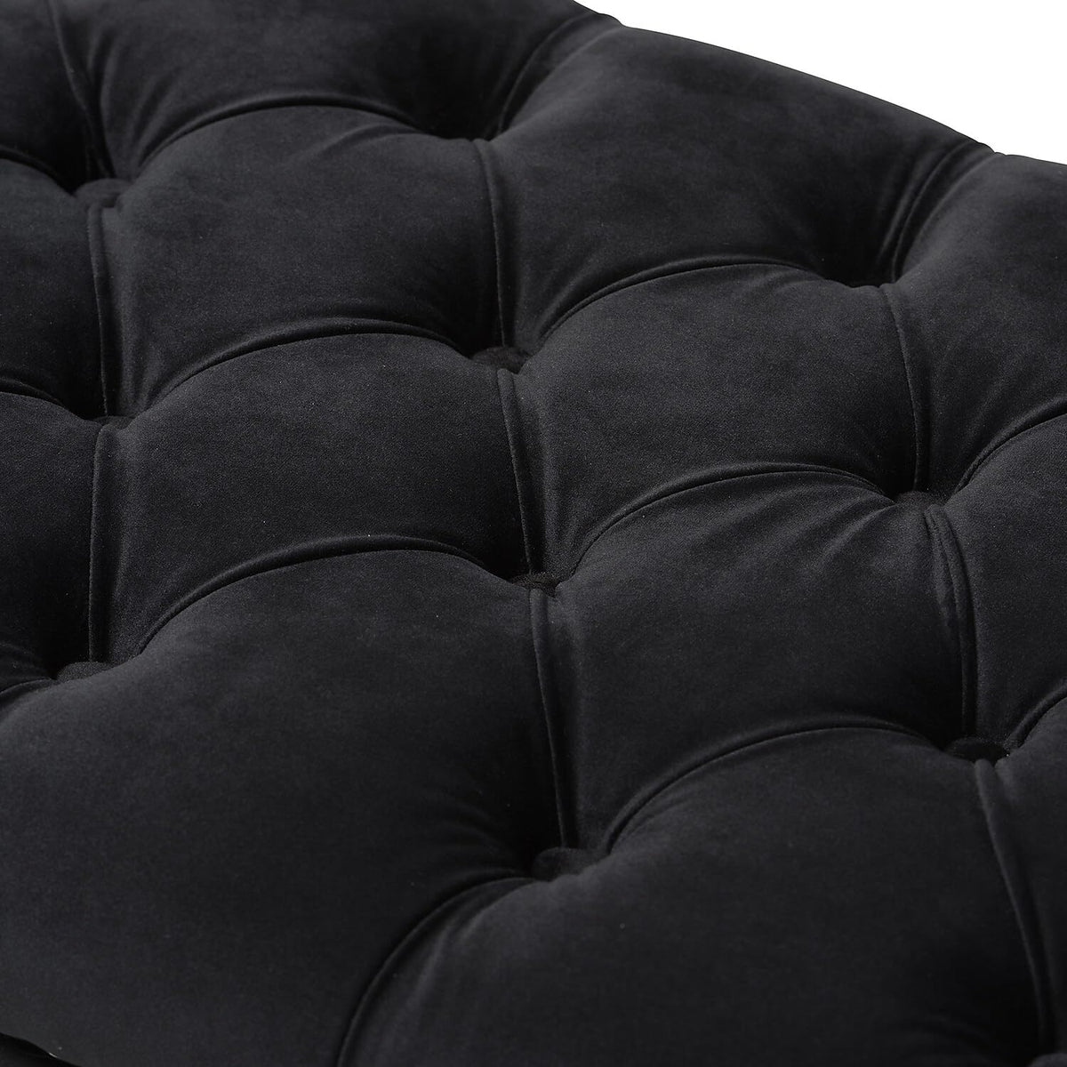 - Luxe and contemporary bench. - Black velvet upholstery. - Black finished wood legs. - Button tufting design. - Silver finish nailhead trim. - Assembly required. - Made in China. - Dimensions: 24.41" High x 51.18" Wide x 18.5" Deep; Seating Dimensions: 17.72" High (from Floor) x 33.46" Wide x 17.72" Deep; Arm Height: 6.69" High; Height (from floor to Top of Arms): 24.41" High; Legs: 12.2" High.