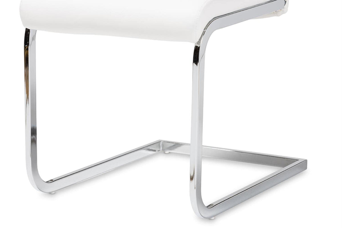 The Cyprien dining chair is both retro and timeless. The mid-century modern-inspired design is evident in the clean lines and gentle curves of the chair. The Cyprien is foam-padded and upholstered in white faux-leather. The chair features chrome-finished, bent legs for a unique look. The gently curved chair back of the Cyprien encourages hours of comfortable seating. Give your dining room a retro vibe with this chair, or add it to your reception area or other shared spaces for extra flair. Made in China, the Cyprien requires assembly.Features Modern and contemporary dining chairWhite faux leather upholsteryChrome finished metal legsRetro inspired bent metal legsGently curved chair backAssembly requiredStyle: ModernColor: WhiteMaterial: Faux Leather,MDF,FoamProduct Size: Dimensions: 37.4' High x 16.93' Wide x 23.23' Deep; Seating Dimensions: 17.91' High (from Floor) x 23.23' Wide x 16.93' Deep; Back: 25' High; Legs: 16.93' High