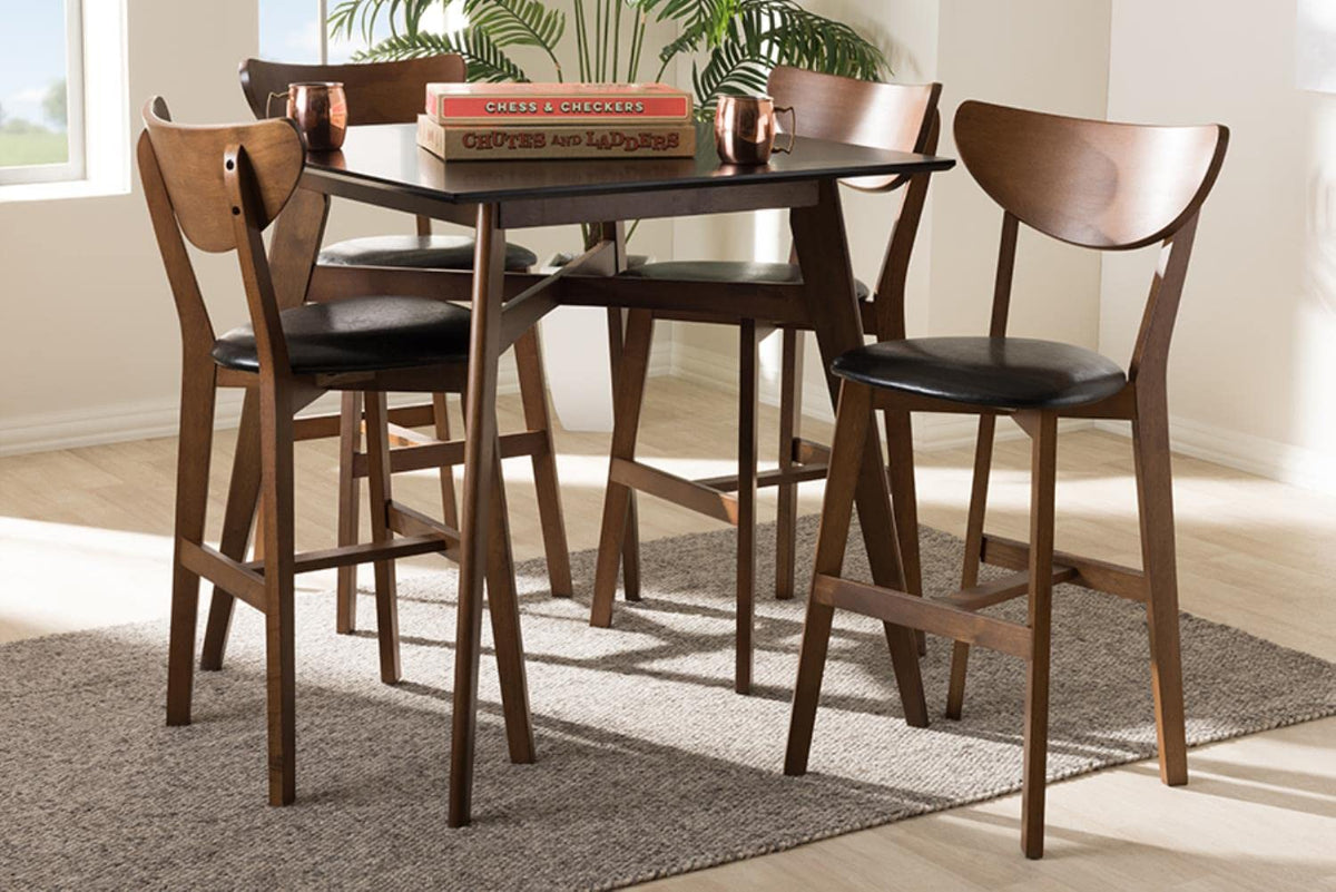 The Eline five-piece pub set is the blend of modern and retro charm that you've been looking for. The mid-century modern-inspired design of the set is clear to see in the gracefully upturned, open, bentwood back design of the stools. The table and stools are built to last with a solid walnut-finished rubberwood and engineered wood construction. The Eline stools feature sophisticated black-faux leather upholstery with a padded seat for hours of comfort. The table of the Eline boasts a unique black top, which can be a conversation starter while entertaining. This pub set will add retro vibes to your dining room, breakfast nook, or rec room. Made in Malaysia, the Eline requires assembly.Features Mid-century modern 5-piece pub setBlack faux leather upholsterySolid rubberwood constructionWalnut wood finishingBentwood back designAssembly requiredStyle: Mid-CenturyColor: Black,Walnut BrownMaterial: Table: Rubber Wood; Stools: Faux Leather,Rubber Wood,FoamProduct Size: Table Dimensions: 36.02' High x 35.43' Wide x 35.43' Deep; Stool Dimensions: 36.42' High x 18.5' Wide x 16.14' Deep; Seating Dimensions: 24.02' High (from Floor) x 16.73' Wide x 15.67' Deep; Back: 12.4' High; Legs: 24.02' High