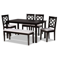 Update your dining space with the contemporary style of the Gabriel 6-piece dining set. Made in Malaysia, the Gabriel includes four dining chairs, one dining bench, and one table constructed from sturdy wood in a dark brown finish that complements the light fabric upholstery. A splendid balance of both comfort and style, the Gabriel features a plush foam-padded seat, as well as a unique cut-out design on its back. Requiring assembly, the large rectangular tabletop allows ample elbow room for each member of the table. Whether it's for casual meals or formal scenarios, the Gabriel dining set easily modernizes any dining space.