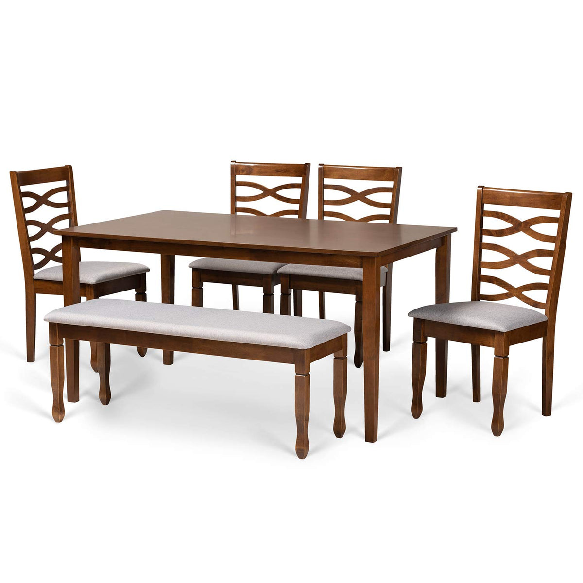 Elegant yet comfortable, the Lanier dining set is a timeless addition to any space. Made in Malaysia, this wooden set includes four dining chairs, one dining bench, and one table. Each seat is upholstered in a light fabric that complements the walnut wood finish. Designed with both comfort and style in mind, each chair features a plush foam-padded seat, as well as a striking cut-out design on its back. Spade feet add a classic, refined touch. Requiring assembly, the rectangular tabletop provides ample elbow room for each member of the table. Equally enjoyable for both formal dinner parties and casual dinners, the Lanier set is sure to enhance any dining experience.