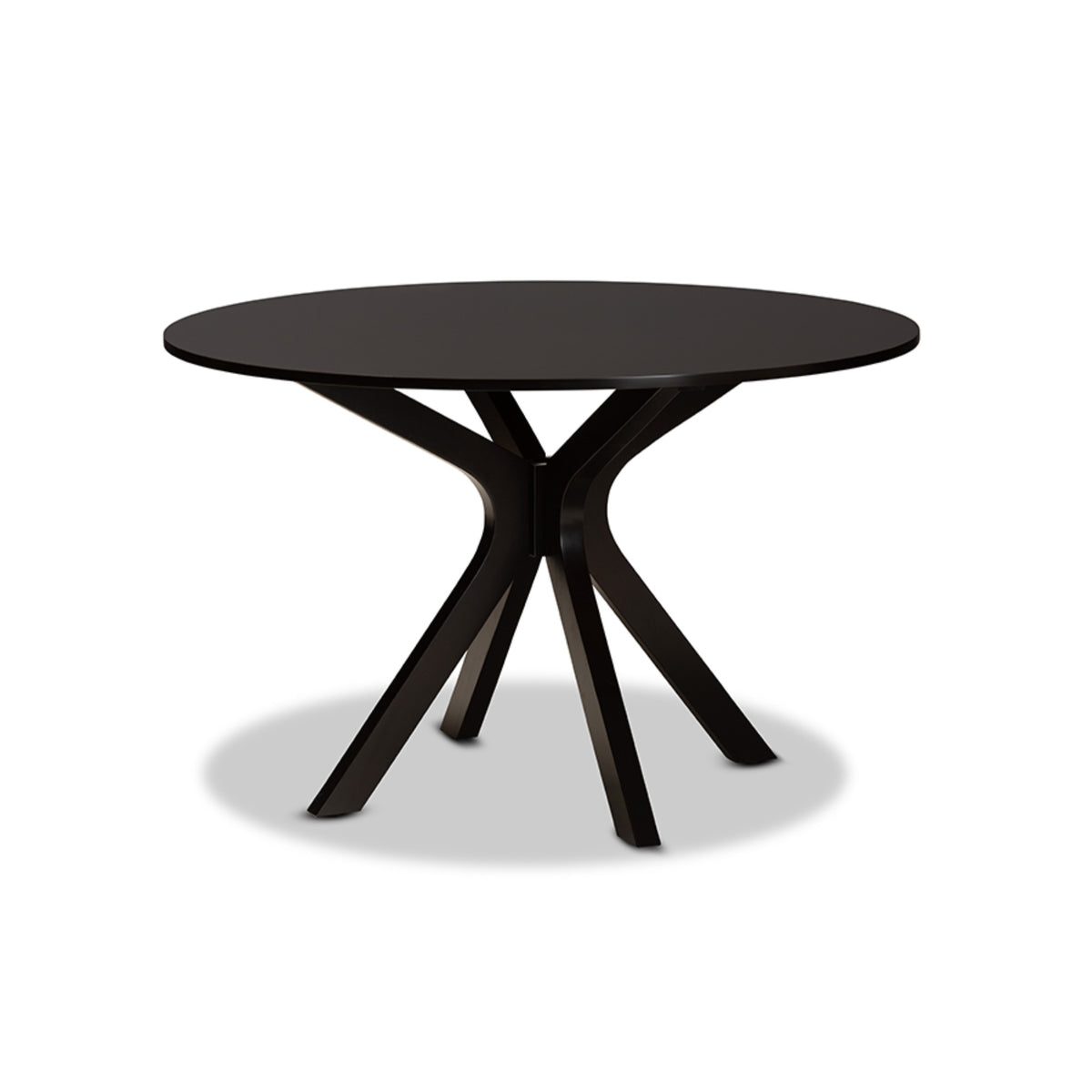 Sleek curves and a rich finish define the Lore dining set. Made in Malaysia, this wooden set includes one table and six chairs, each upholstered in a light fabric that complements the dark brown wood finish. Designed for both comfort and style, each chair features a plush foam-padded seat, as well as an exquisite cut-out design on its back. The round tabletop is supported by splayed legs that form a unique sculptural base, creating a chic profile from any angle. Requiring assembly, the Lore dining set is well suited for both casual and formal dining.