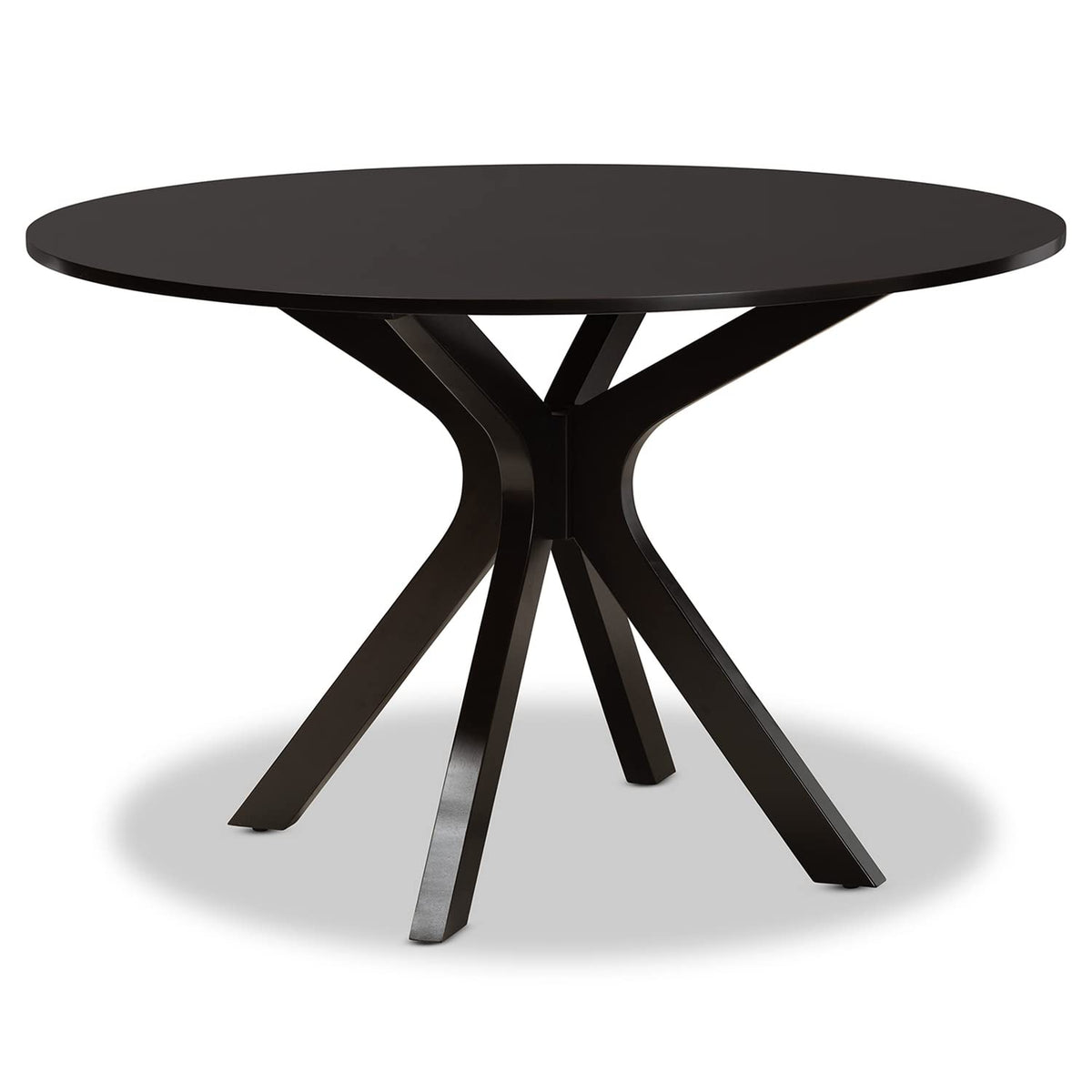 - Set includes one (1) table and six (6) chairs - Constructed from oak wood, rubberwood, and MDF wood - Two-tone dark brown and walnut brown finish - Smooth scoop seat - Cut-out backrest - Circular tabletop - Assembly required.