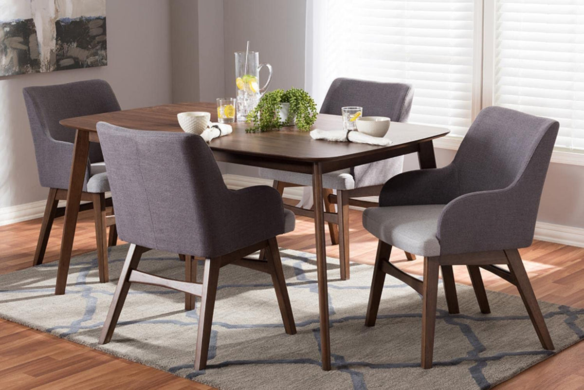 Baxton Studio Monte Mid-Century Modern Walnut Wood Rectangular 5-Piece Dining Set Grey//Medium Wood/Mid-Century/Table/Fabric Polyester 100%"/Rubber Wood/Solid Wood/Mdf/Foam