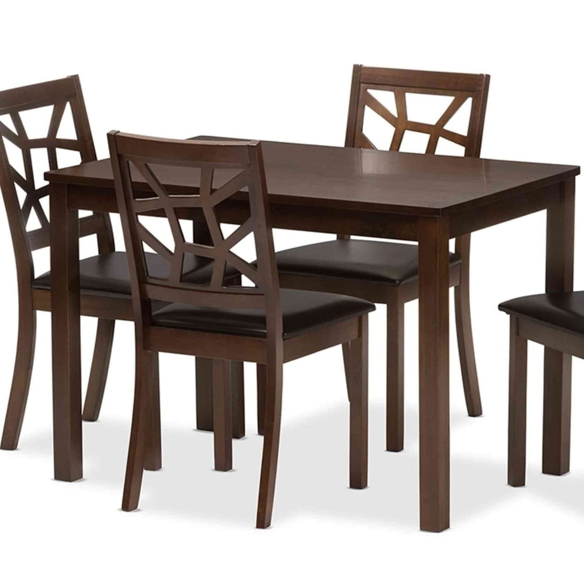 Showcasing dazzling mosaic-like chair-back designs, our Mozaika Wood and Leather Contemporary 5-Piece Dining Set certainly has something to say. But the transparently trapezoidal backrest slats represent only part of this contemporary dining set's charm. Black faux-leather seats combine with dark-brown stain wood to make a timeless statement. This five-piece set features four chairs and a sturdy table for years of use.