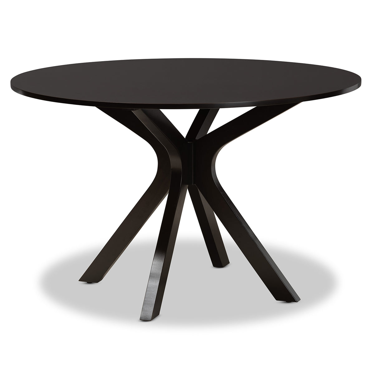 Contemporary design and superb comfort create the stunning Sanne dining set. Made in Malaysia, the Sanne includes six dining chairs and one table constructed from sturdy wood in a rich dark brown finish. Each chair is fitted with a foam-padded cushion upholstered in a smooth sand tone fabric and features a unique cut-out design on its back. Requiring assembly, the large, circular tabletop allows ample elbow room for each member of the table. Ideal for both casual and formal occasions, the Sanne dining set easily modernizes any dining space.