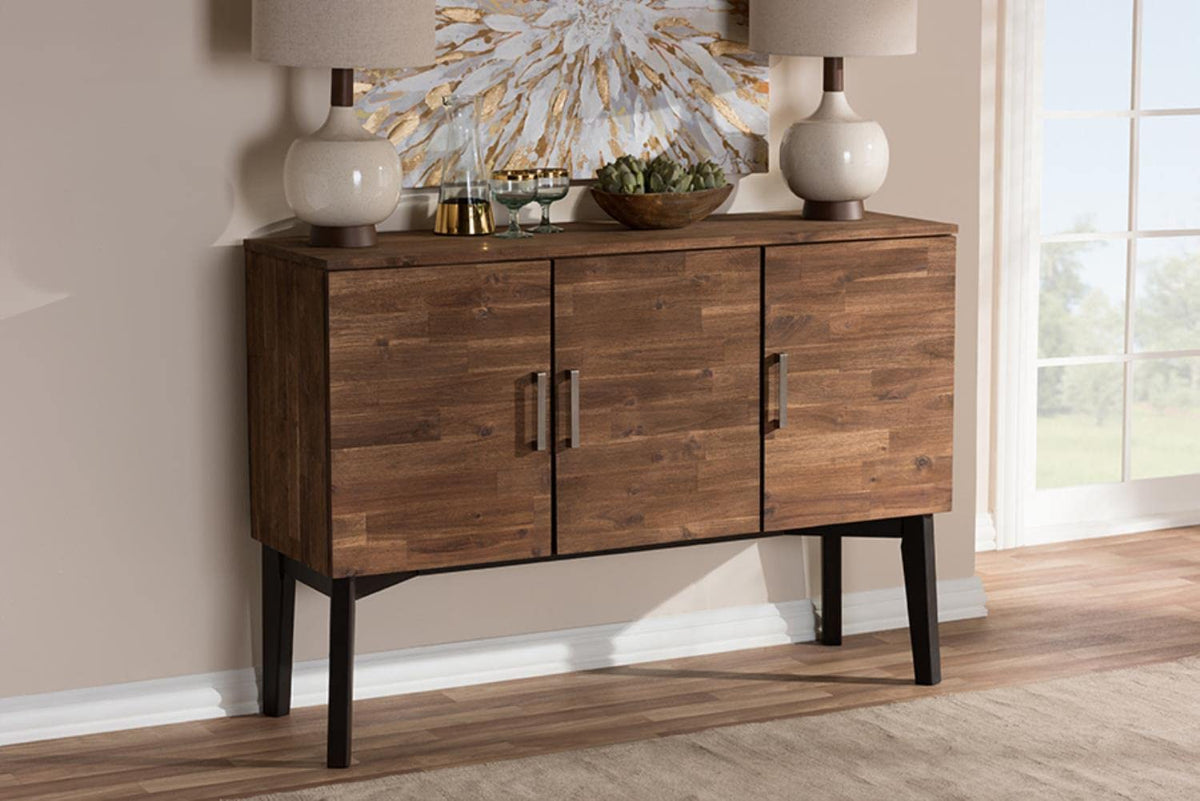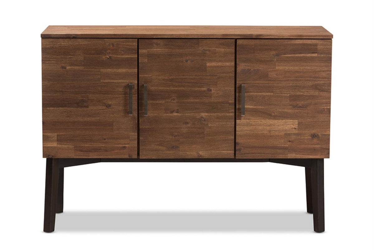 Embrace retro styling to complement your contemporary interior with the handsome tones of the Selena sideboard, caramel brown and dark brown two-tone. Constructed of solid Acacia wood and rubberwood frame and legs, the Selena 3-door sideboard buffet is built for durability with lasting good looks. Three doors open up to ample storage space for your book collection, board games or even fine china for versatility. Slim drawer metal handles provide simple functionality with minimalist looks. Versatile in styling, the sideboard complements mid-century modern themes to retro-inspired interiors. Made in Malaysia, the Selena requires legs assembly.Features Mid-century modern 3-door sideboard buffetCaramel brown and dark brown two-tone finishingThree drawersMetal drawer runnersAssembly requiredMade in MalaysiaDimensions: 33.07' High x 51.18' Wide x 16.54' DeepSET INCLUDES: One (1) SideboardSTYLE: Mid-CenturyMATERIAL: Acacia Wood/Rubber Wood/MetalCOLOR: Brown